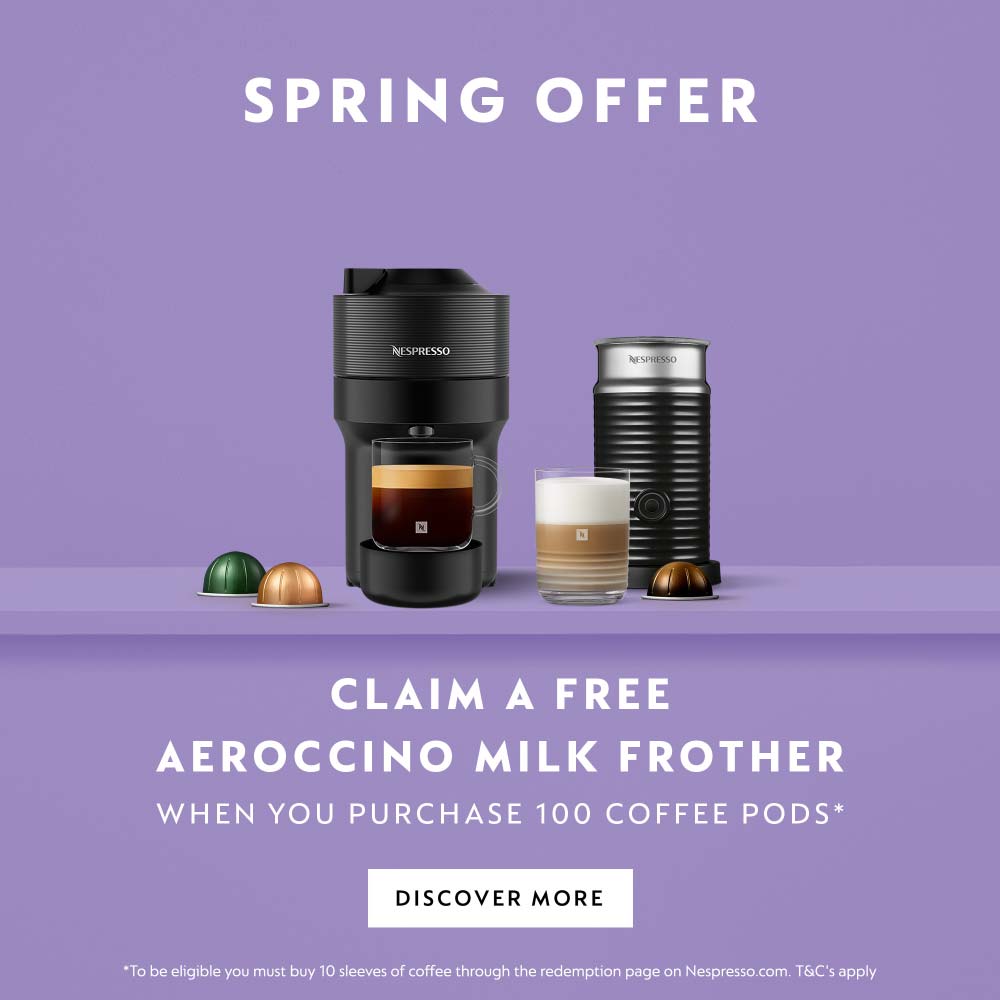 Get a free Aeroccino milk frother when purchasing 100 coffee pods with a new Vertuo or Classic range coffee machine.