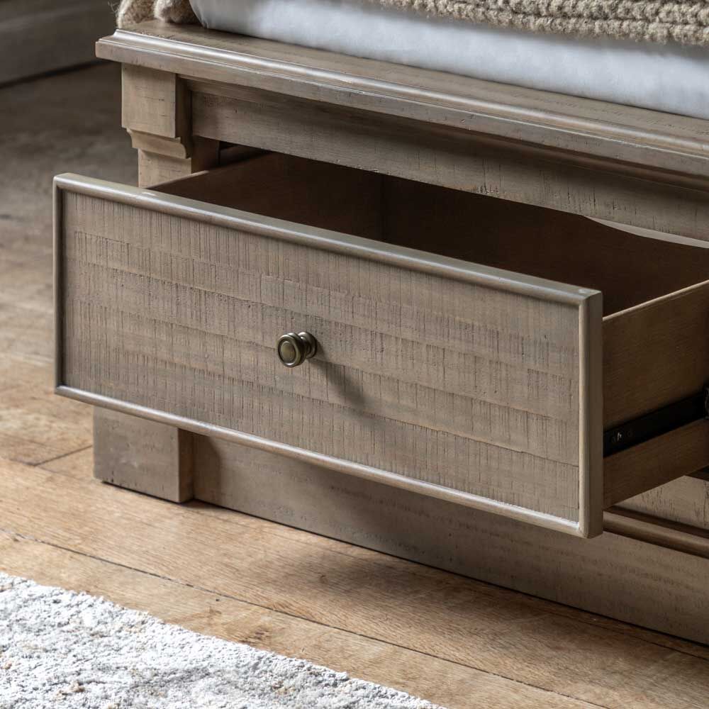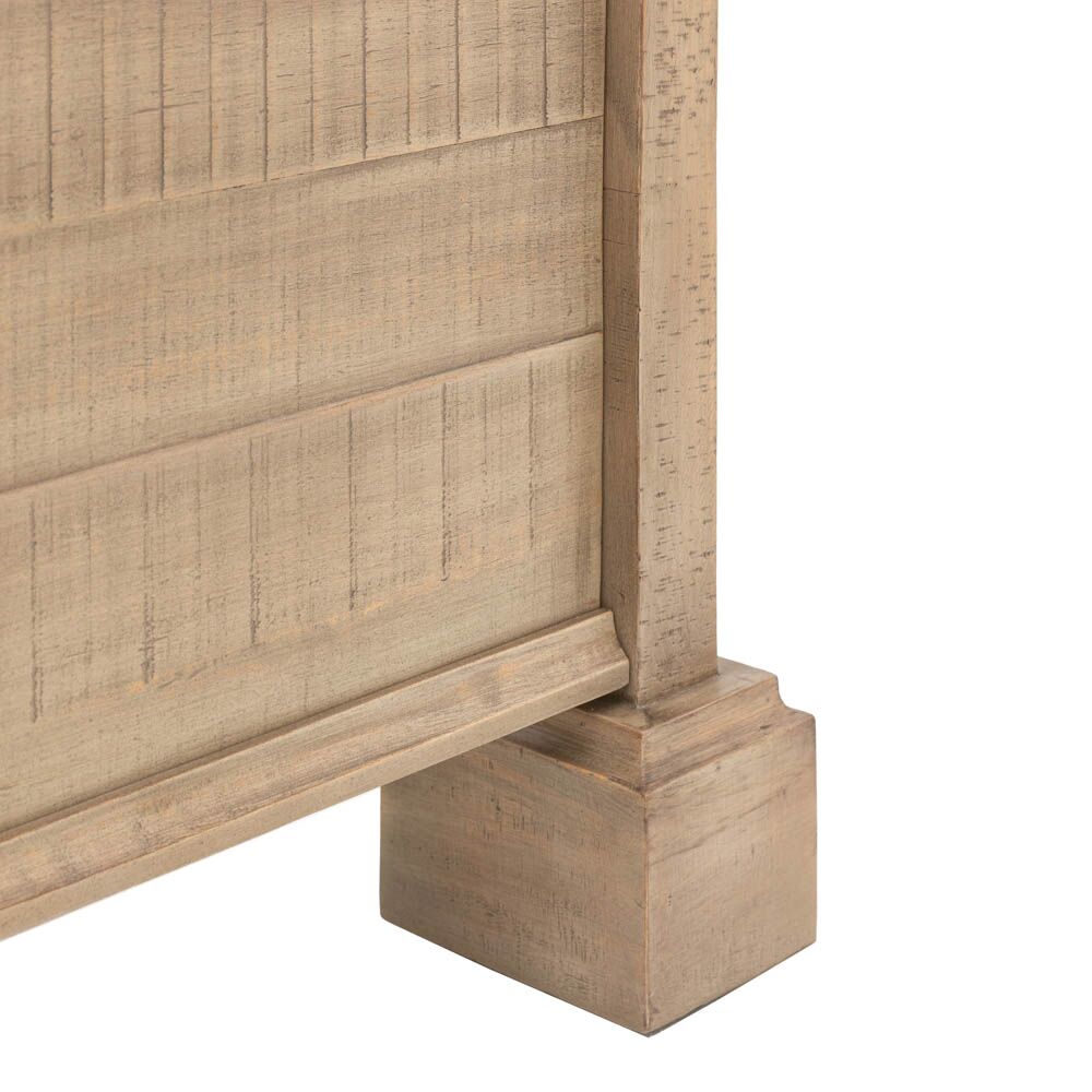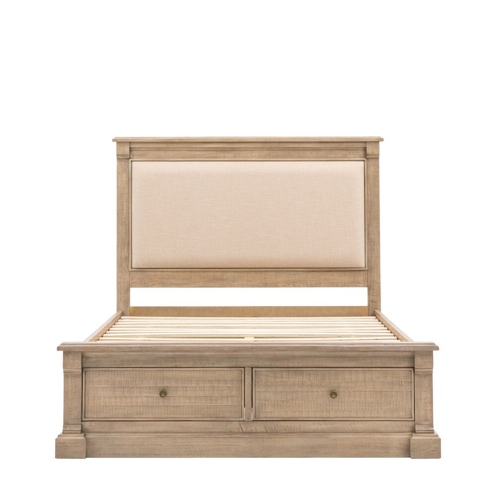 This bed is a stylish and functional addition to any bedroom. Its weathered wood frame exudes a timeless charm, while the upholstered headboard provides a touch of luxury and comfort. The built-in storage drawers offer ample space for bedding, clothes, or other items, making it a practical choice for smaller spaces. This bed is perfect for those who appreciate a blend of rustic style and modern convenience.