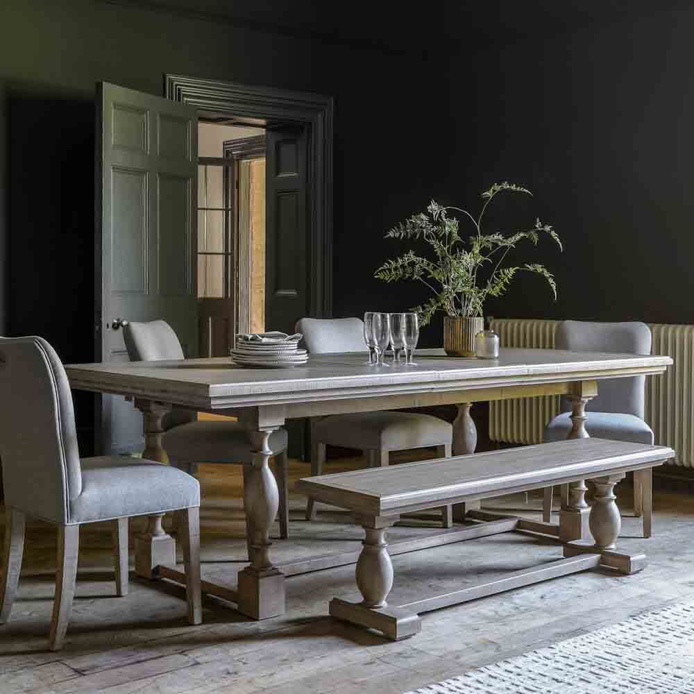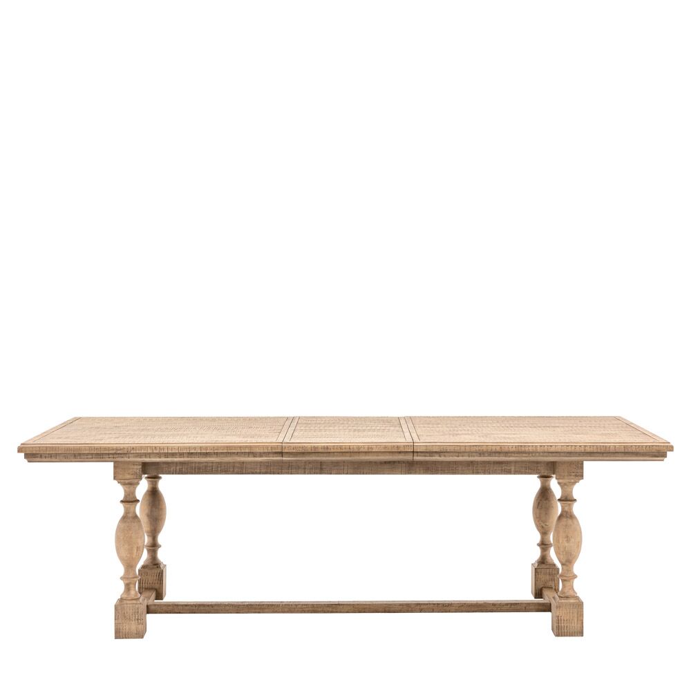 This beautiful dining table offers an updated classic look and is ideal for larger spaces, extending when needed to create more seating space. It is crafted from North American pine solids and veneers where practical, with the clever use of a mill saw giving characteristic features of cross sawn timber to create a tactile, dramatic finish. Matching pieces are available.