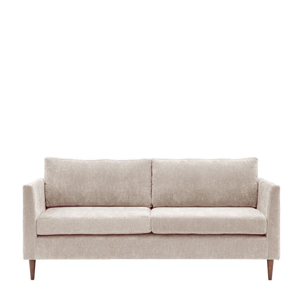 This contemporary 3-seater sofa offers a simple stylish design which would suit a wide range of interiors. Upholstered in a beautiful soft grey fabric with deep seat and back cushions for comfort, the turned wooden legs echo the shape of the gently tapered arms in a lovely design detail. Matching armchair and 2-seater sofa are available to give a coordinated look to a room.