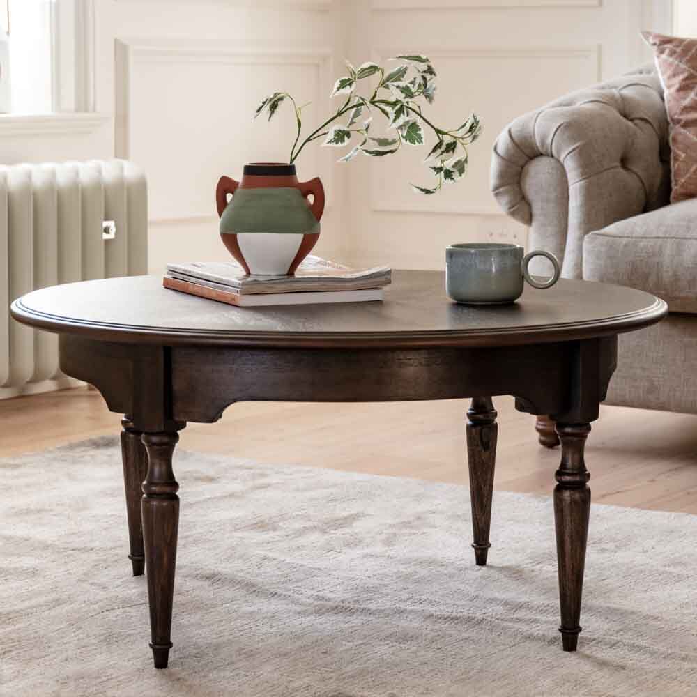 Offering a ?new traditional? look, with its timeless, elegant style and a modern touch. This stunning coffee table features exquisite dark salvaged coffee colour finished Mindy wood solids & veneers, with elegant inlaid marquetry details adding a final elegant touch.