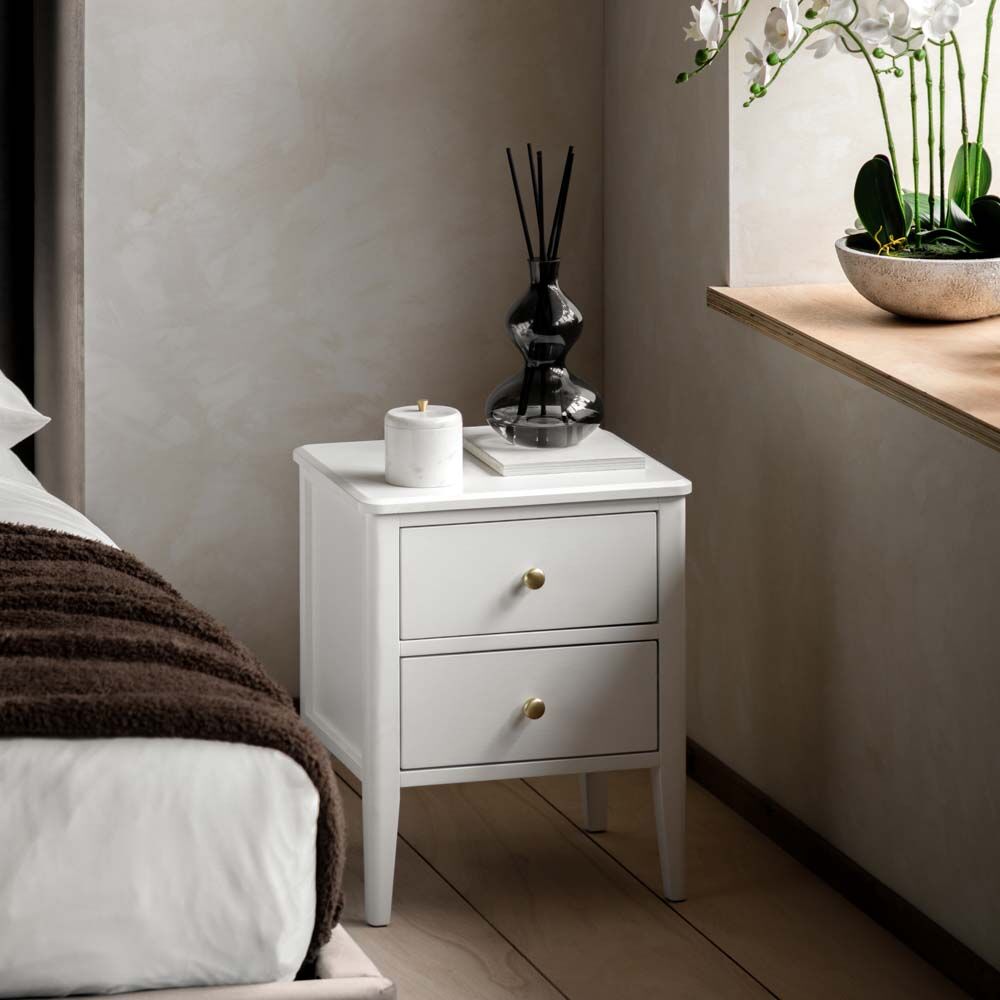Elevate any bedroom with this sophisticated bedside table. Its fresh white finish is perfectly complemented by elegant gold handles, bringing a touch of modern luxury to any space. Two spacious drawers offer convenient storage, keeping essentials close at hand. A perfect blend of style and functionality.