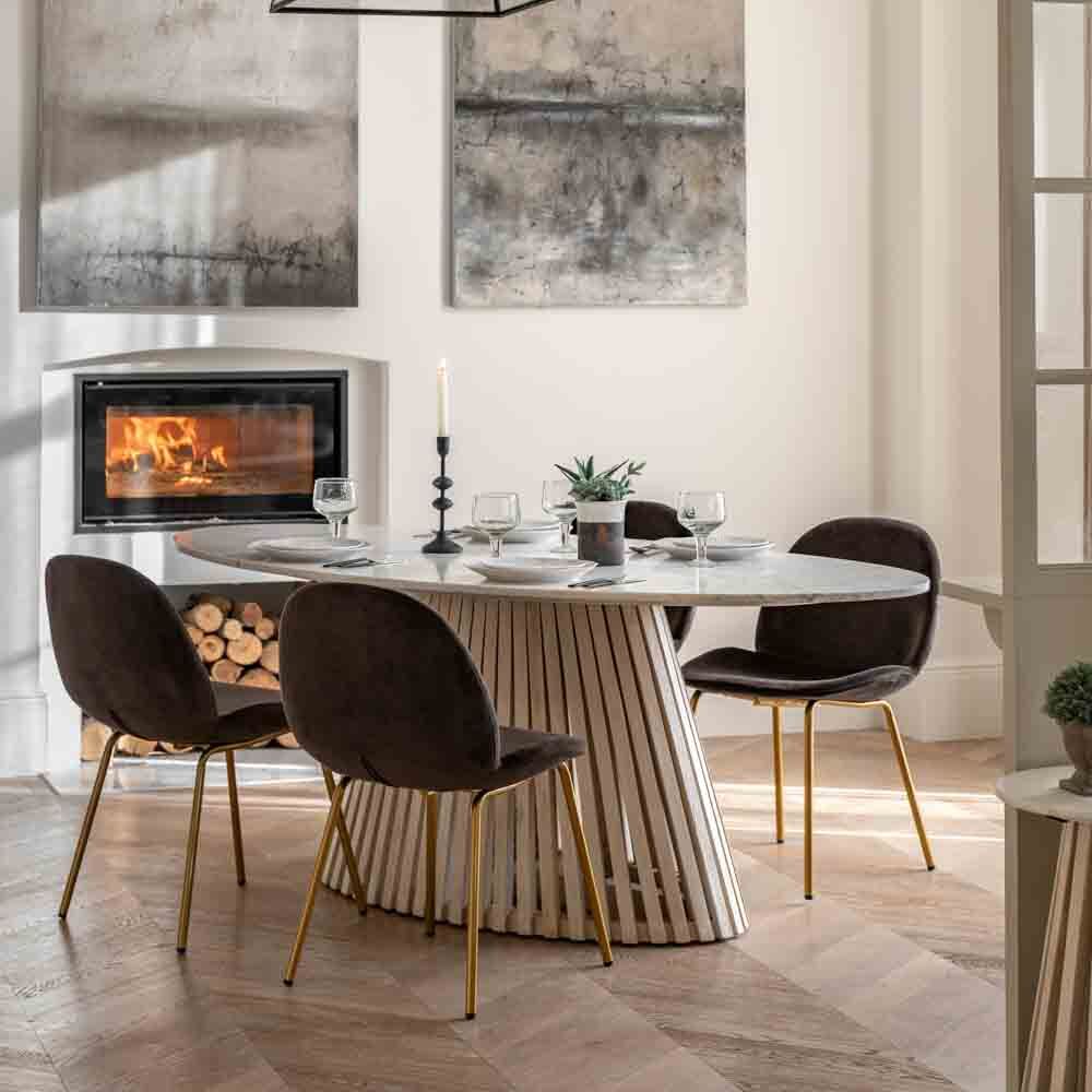 Offering stylish contemporary design, this beautiful oval dining table has a stunning white Indian marble top which is paired with a stunning base to create an elegant, classy table. The base is crafted from gently sloping slats of mango solid timbers with a white-washed, sand-blasted finish, creating a striking design feature. Matching items are available.