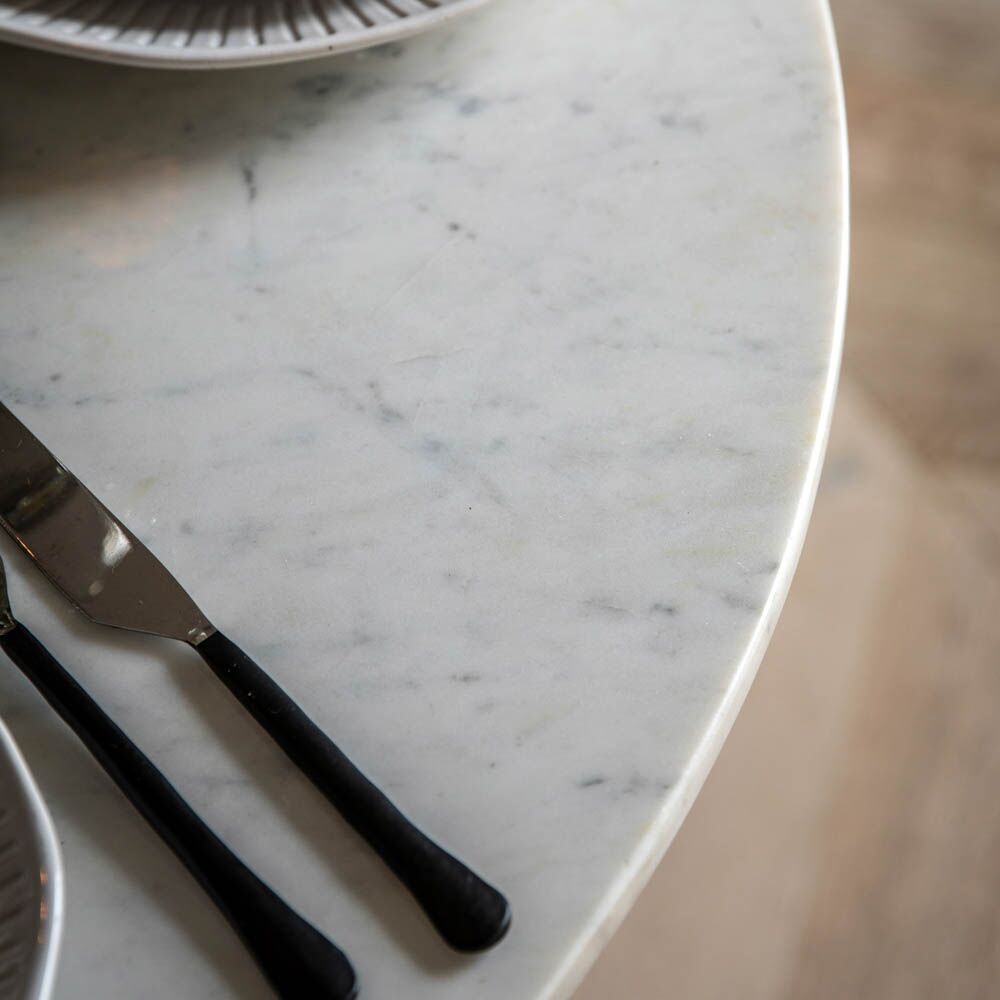 This lovely round dining table offers stylish contemporary design. The base is crafted from gently sloping slats of mango solid timbers with a white-washed, sand-blasted finish to create a striking design feature. This stunning base is paired with a beautiful white Indian marble top, creating a classy, elegant piece of furniture. Matching items are available.