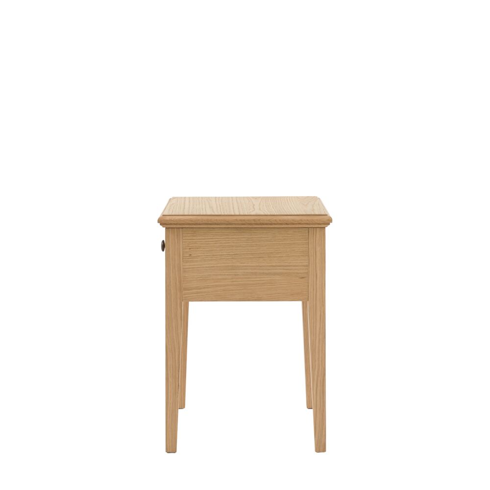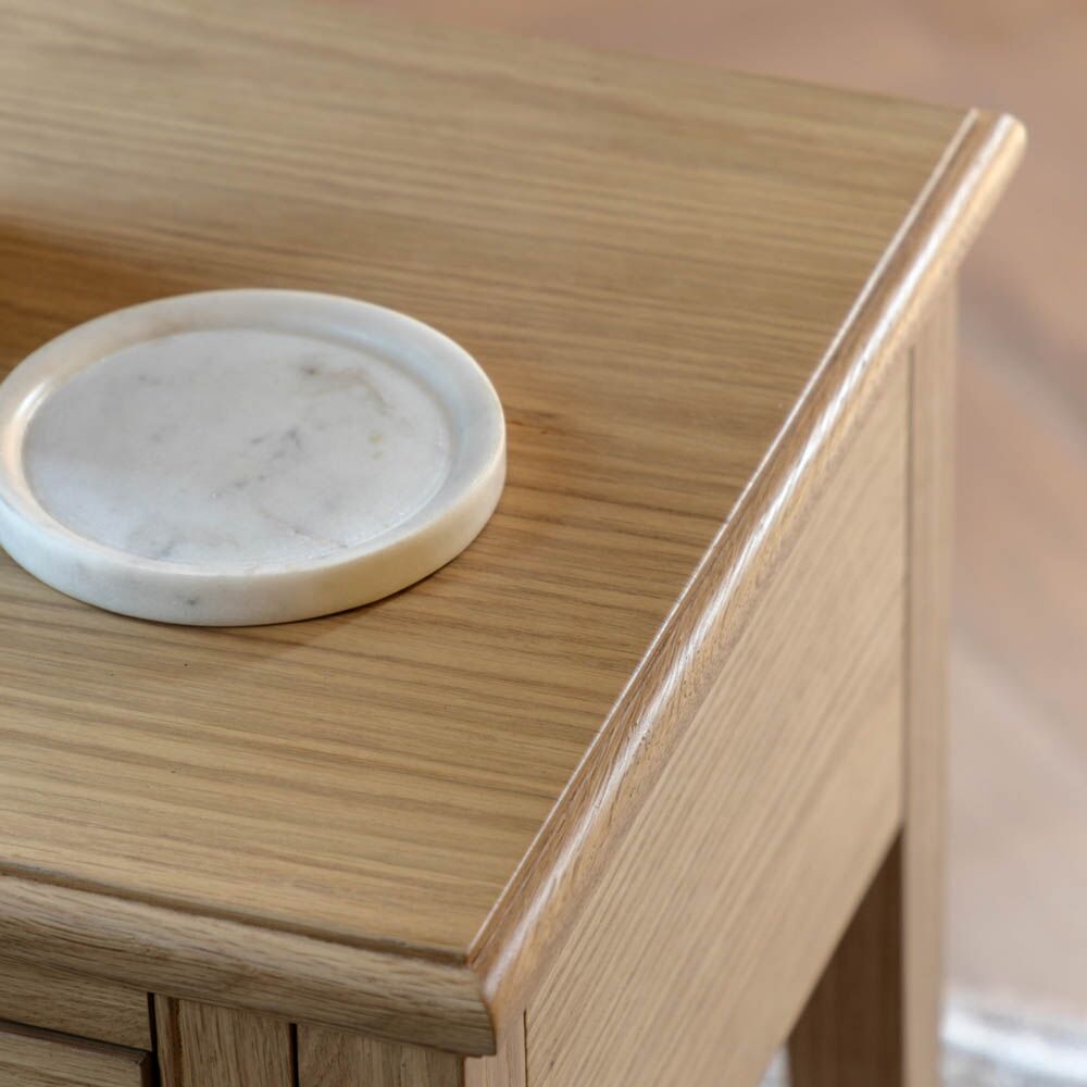 Introduce elegant simplicity to your living space with this charming side table. The elegant design, crafted from beautiful oak solids & veneers, offers a light and airy feel while showing off the subtle grains and natural beauty. A single convenient drawer, accented with a classic round handle, provides the perfect spot for your essentials, blending timeless style with effortless functionality.