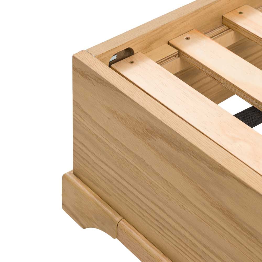 Create the perfect sleep sanctuary with this beautifully crafted wooden double bed frame. The elegant, clean lines and beautiful natural wood finish, crafted with premium solid oak and veneers, exudes timeless style, seamlessly blending into both modern and traditional bedrooms. The supportive slatted headboard offers a comfortable backrest, designed for comfort and lasting beauty.