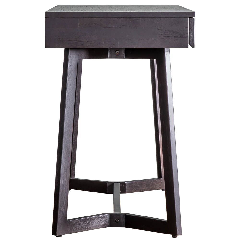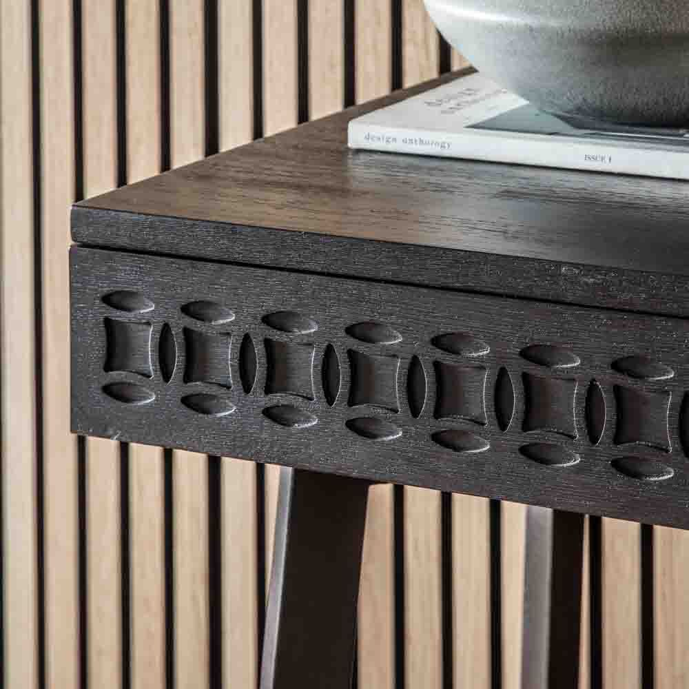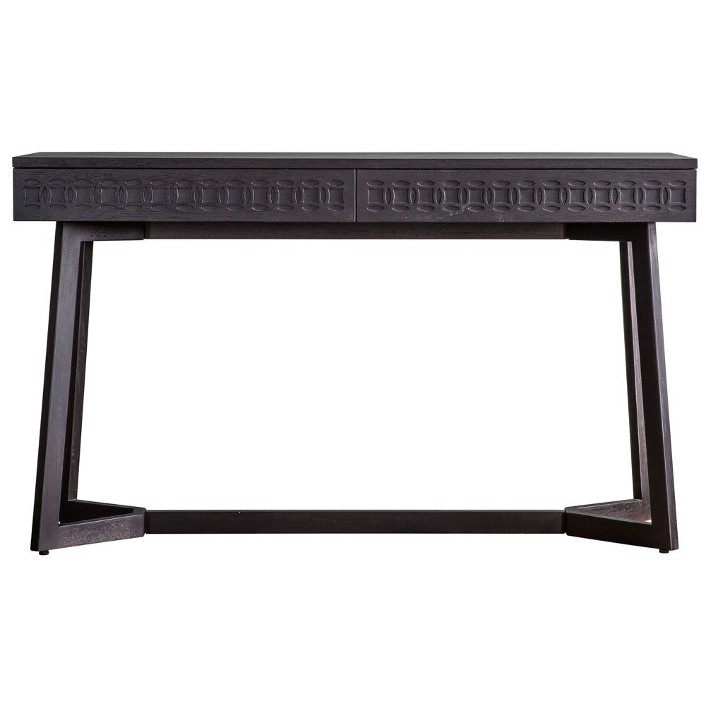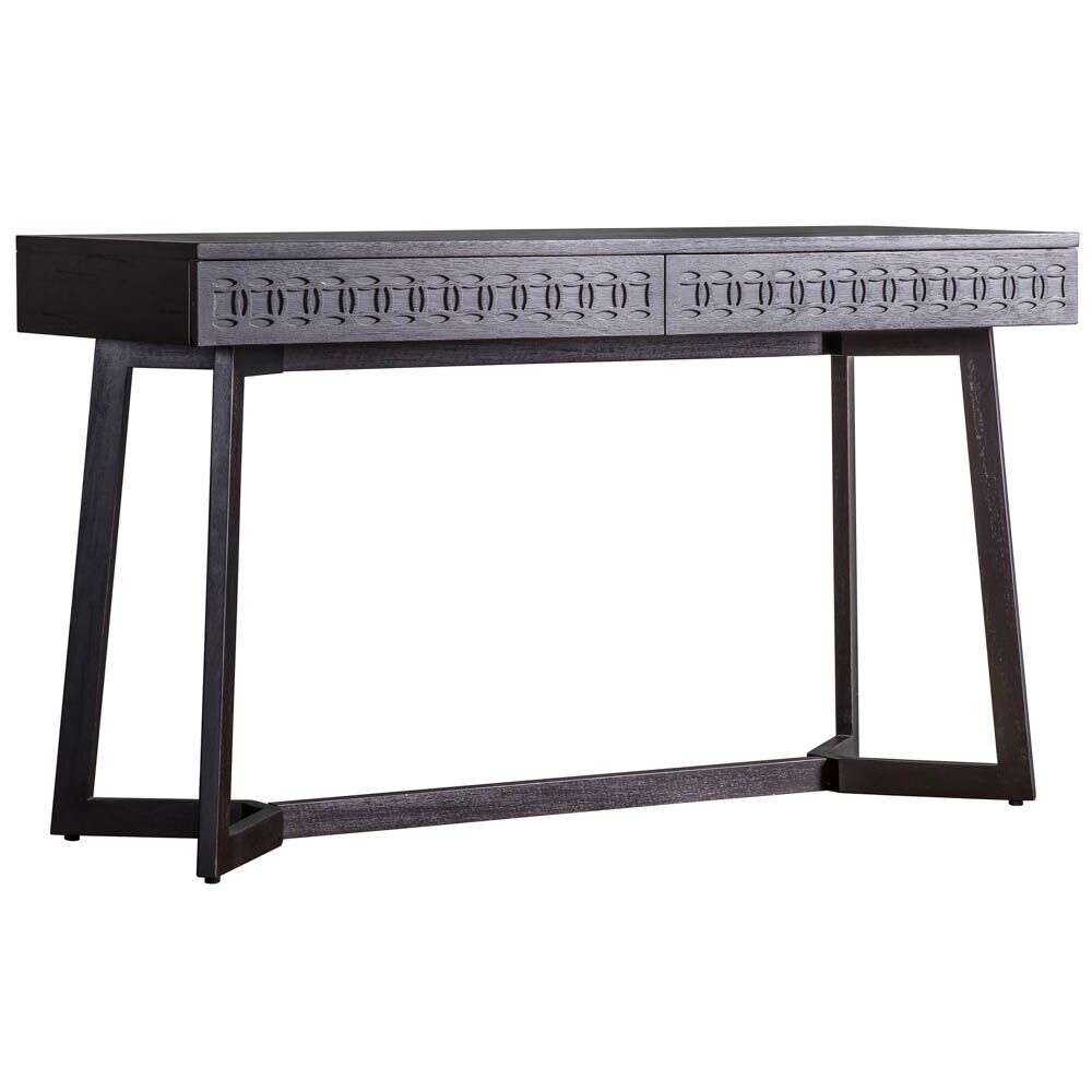 This versatile desk can be mixed with modern or classic pieces in an eclectic living space. A patterned frieze of blind fretwork on the drawer fronts of this chic desk adds intricate detail whilst the different hard and soft grains in the timber stand out in the light and catch the eye. With a stunning mat black charcoal finish. A light brown finish is also available.