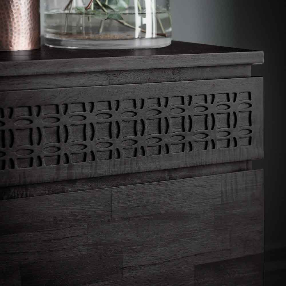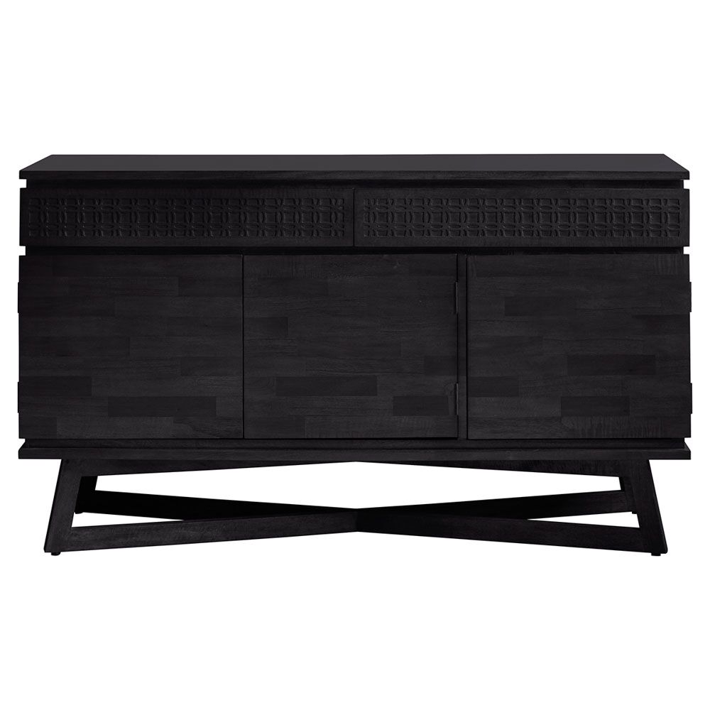 This 3 Door 2 Drawer Sideboard is made using Mango solids with mixed timber veneers of Teak-Mahogany-Mindy Ash and Mango which give contrast and make the inlaid pattern stand out. It has a stunning mat black charcoal finish – the different grains in the mixed timbers stand out in the light and catch your eye with this beautiful detail.