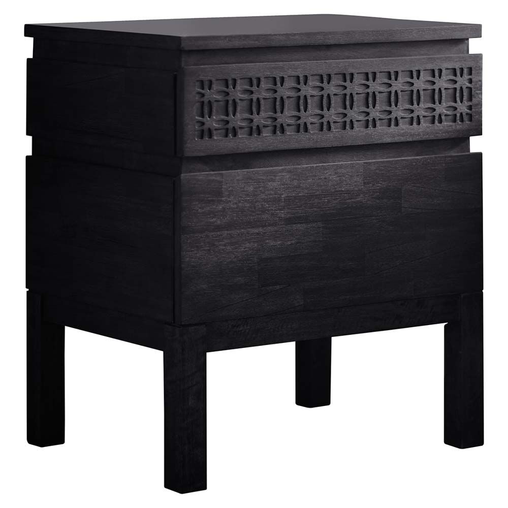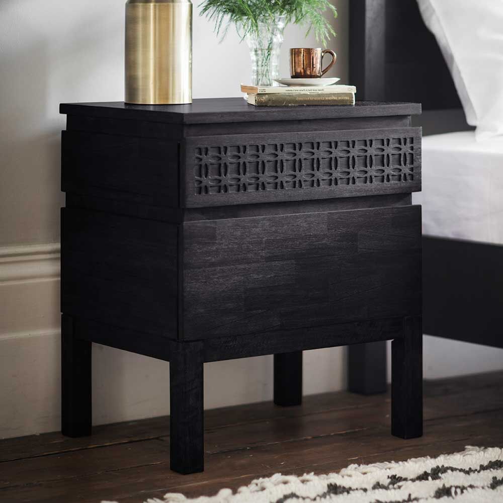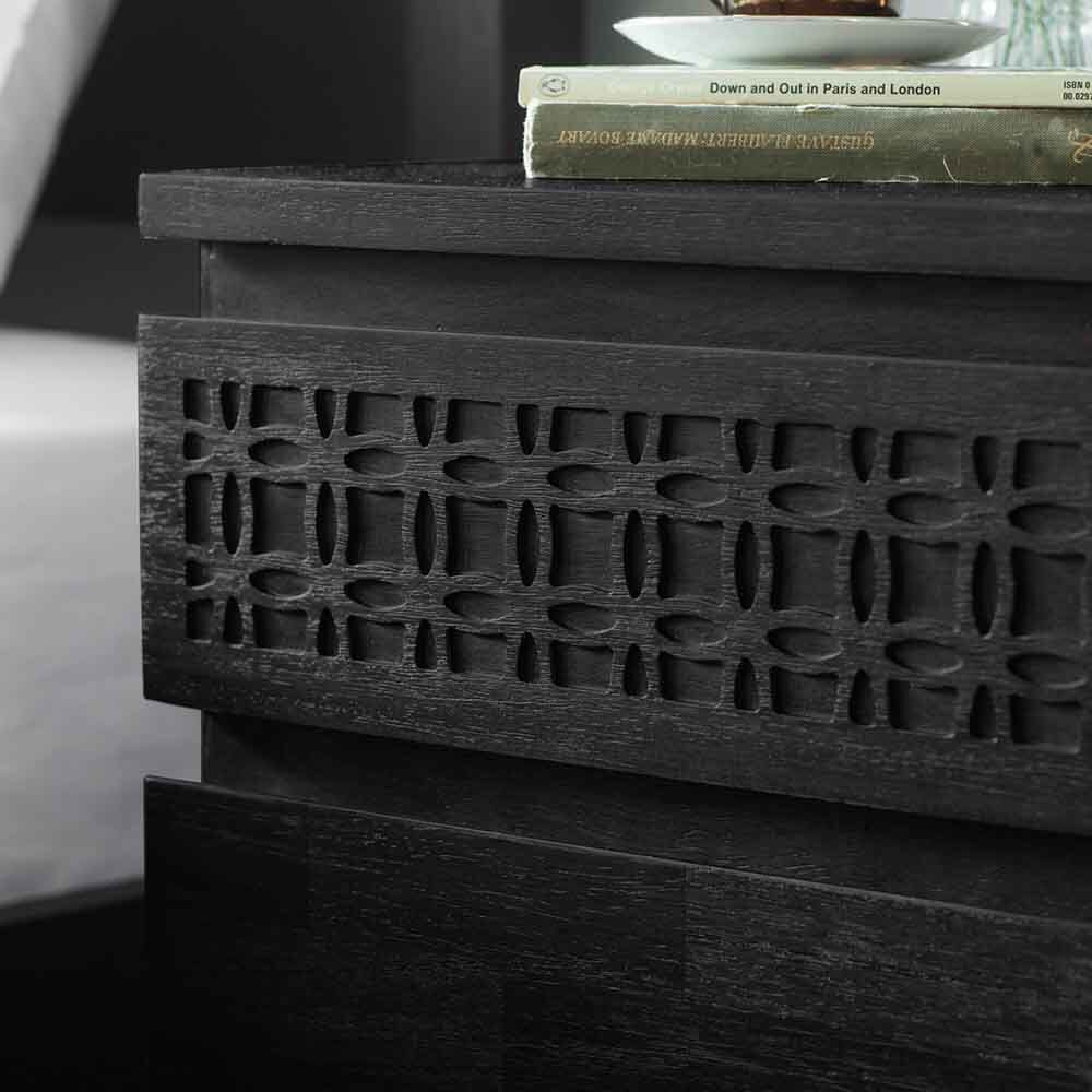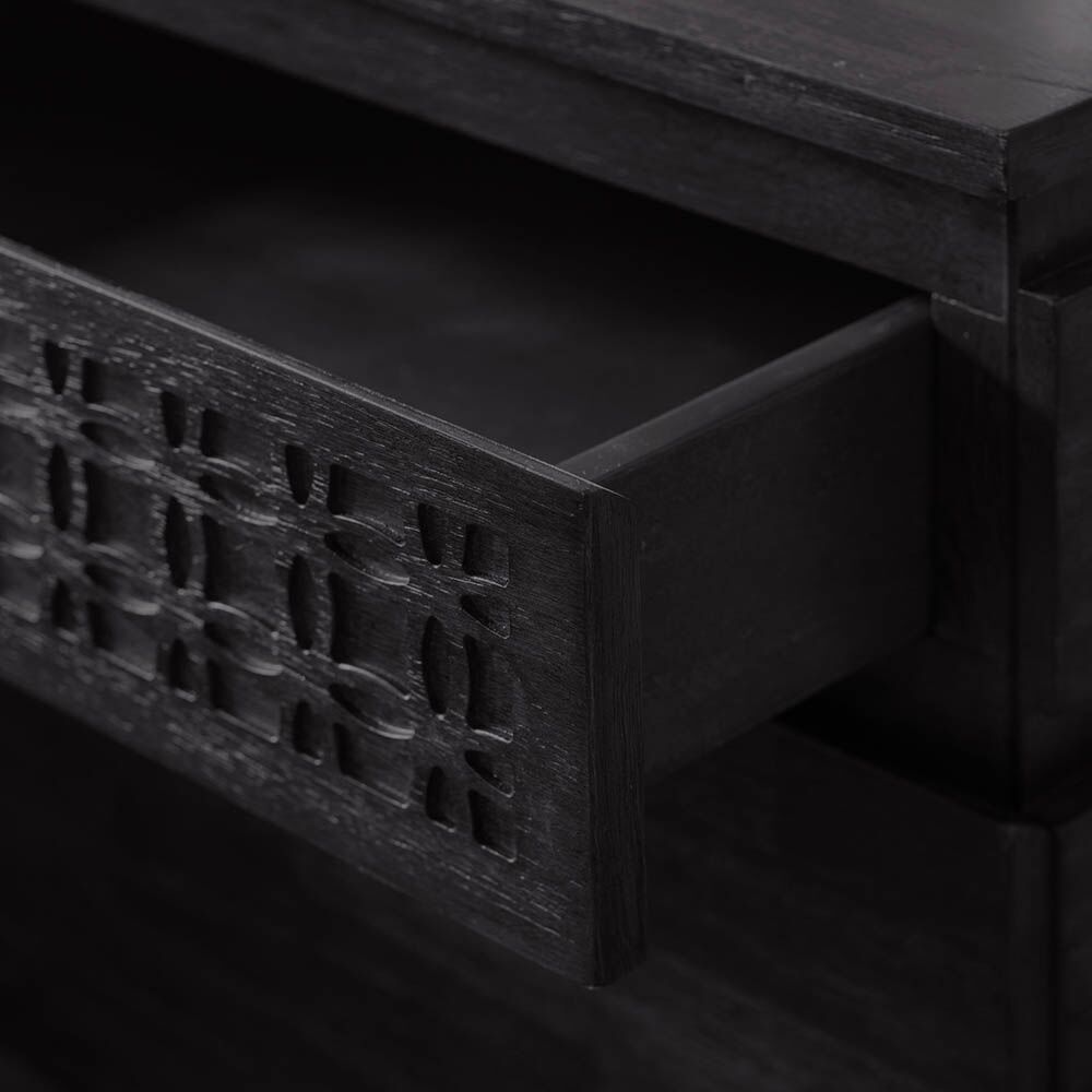 Offering a global traveller look that has a hint of ethnic design detail, this beautiful chest of drawers is exciting but timeless in its approach and so can be mixed with modern or classic pieces in an eclectic living space. Made using Mango solids with mixed timber veneers of Teak-Mahogany-Mindy Ash and Mango which give contrast and make the inlaid pattern stand out. It has a stunning matt black charcoal finish – the different grains in the mixed timbers stand out in the light and catch your eye with this beautiful detail.