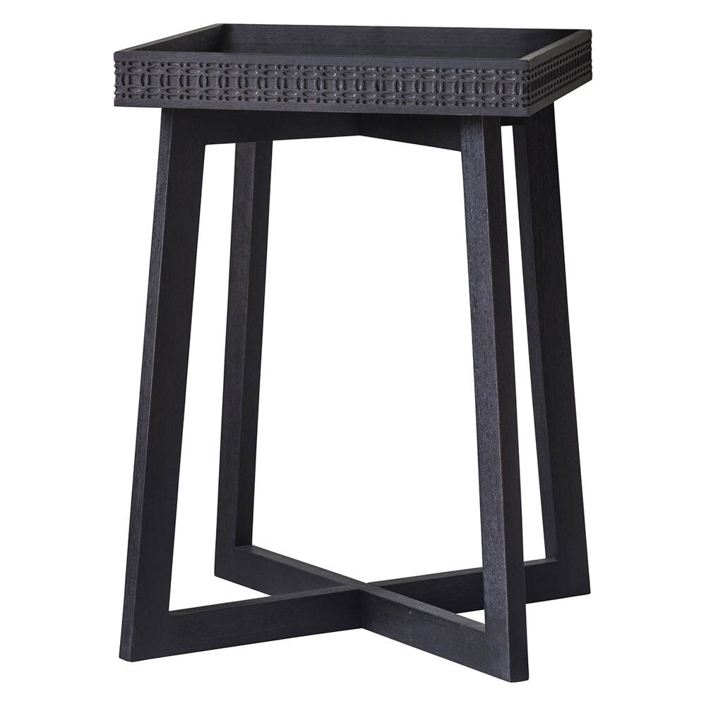 The table features a patterned frieze of blind fret work, made from solid mango wood, around the tray-style top.