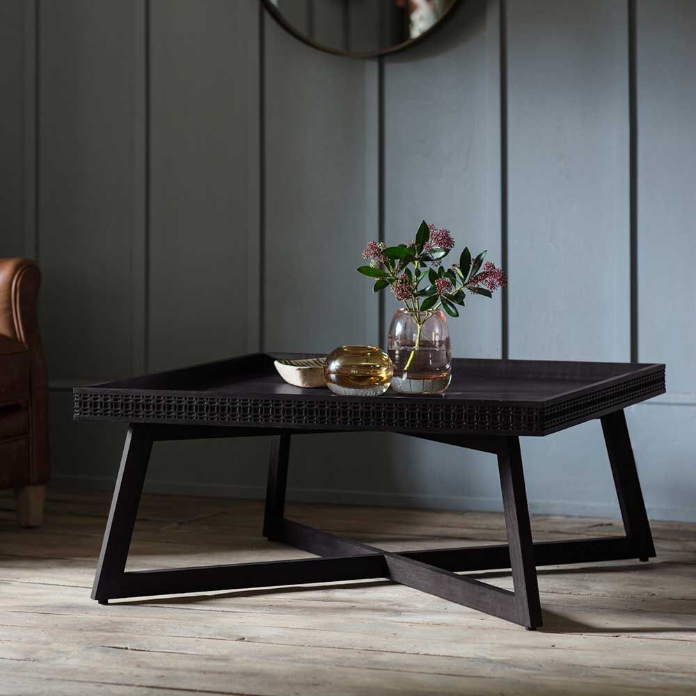 Offering a global traveller look that has a hint of ethnic design detail, this beautiful table is exciting but timeless in its approach and so can be mixed with modern or classic pieces in an eclectic living space. Made using Mango solids with mixed timber veneers of Teak-Mahogany-Mindy Ash and Mango which give contrast and make the inlaid pattern stand out. It has a stunning mat black charcoal finish – the different grains in the mixed timbers stand out in the light and catch your eye with this beautiful detail. The table features a patterned frieze of blind fret work, made from solid mango wood, around the tray-style top.
