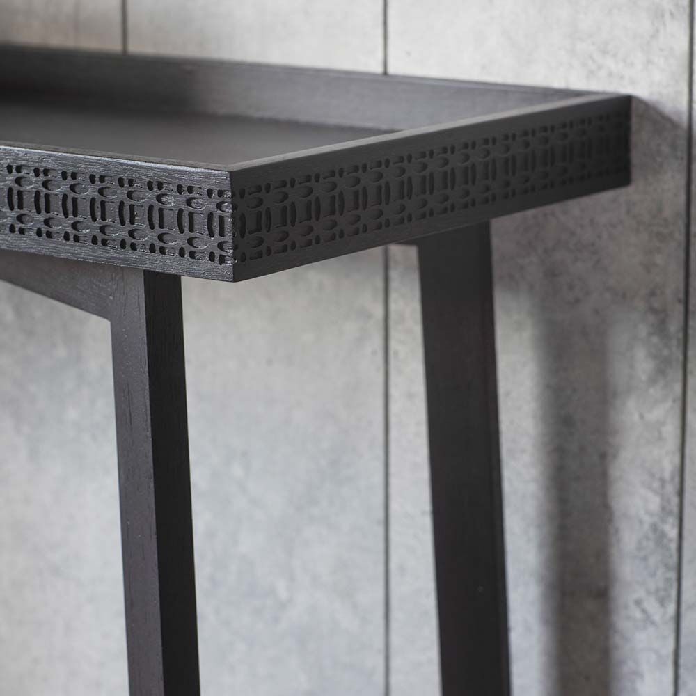 The table features a patterned frieze of blind fret work, made from solid mango wood, around the tray-style top.