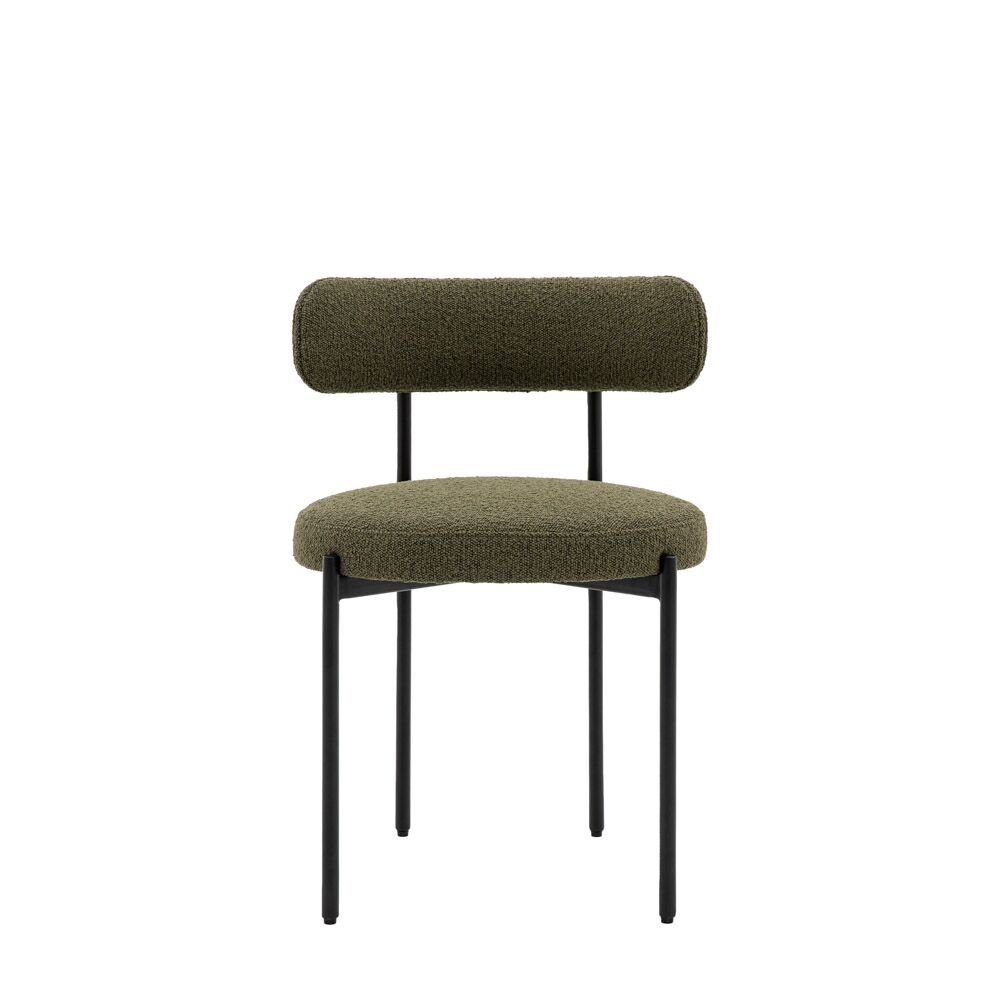 Add a stylish design touch to a room with this pack of two stunning dining chairs. The seats and back rails are upholstered in a lovely green fabric, with the curved back echoing the shape of the round seat, and the black metal legs and frame perfectly complementing these. Also available in other colours.