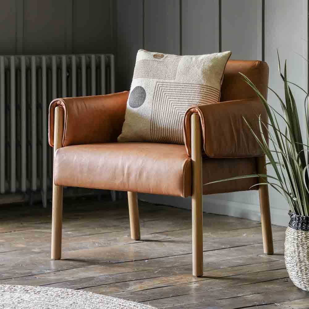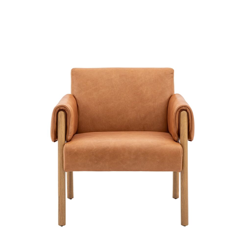 This stunning contemporary armchair is upholstered in lovely brown leather which pairs beautifully with the wooden arms and legs. Adding an unusual, stylish design detail, the wooden arms are wrapped in leather upholstery, adding comfort and style. A matching sofa is available.