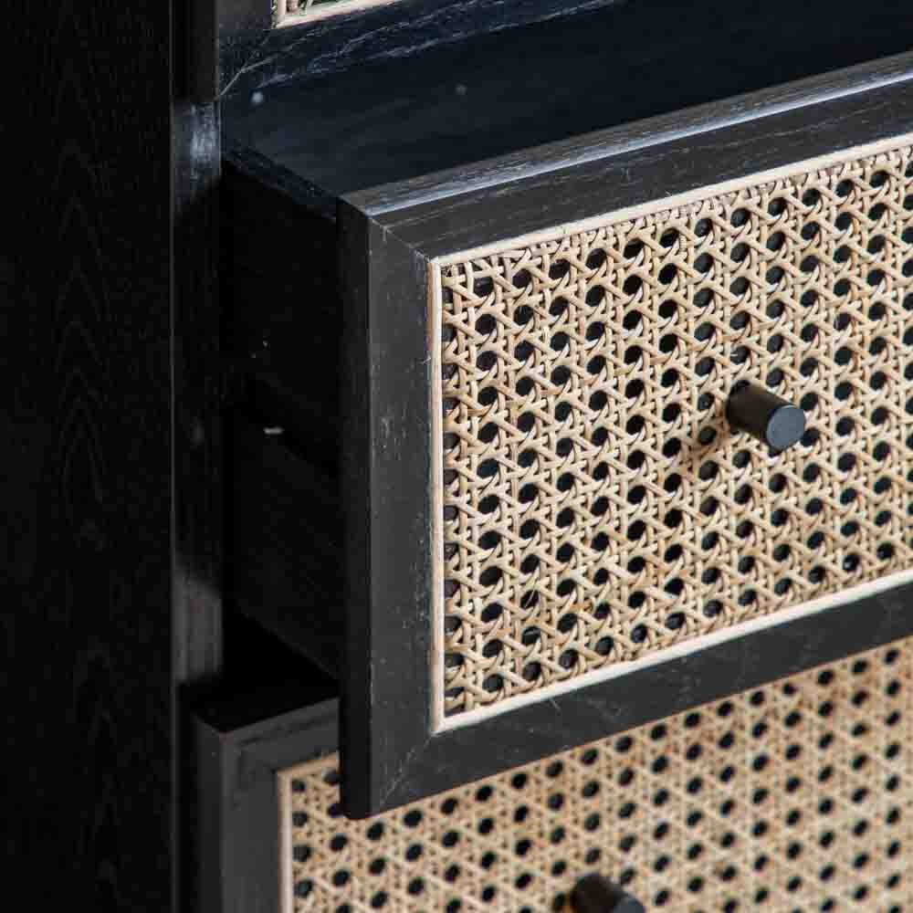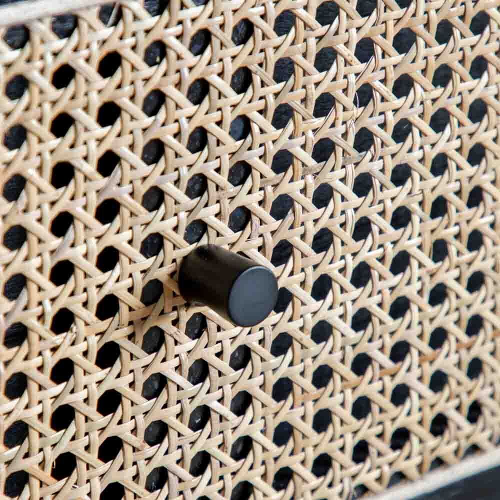 Dramatically stylish this 3 drawer chest combines practicality and statement style. Black stained solid oak & veneers create stunning contrast with the natural rattan woven drawer panels, creating piece of stand out bedroom furniture. With a hint of art deco glamour the simply shaped body and elegantly tapered legs let the contrasting materials speak for themselves.