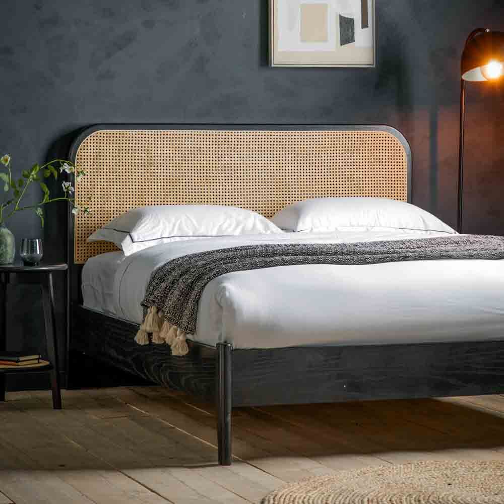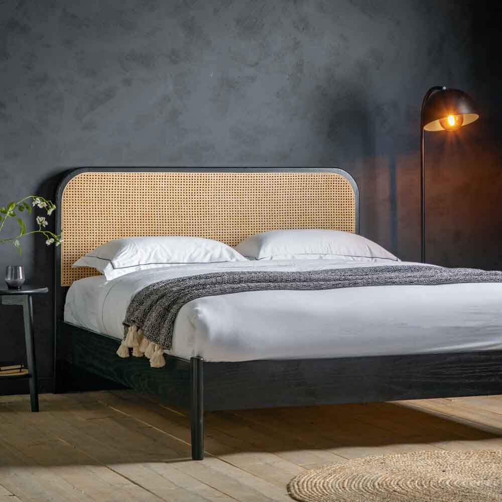 Dramatic statement style sure to become a modern classic. The solid black stand oak frame combines comfort and style ease, with curved corner headboard featuring a woven rattan panel creating a stunning stand out contrast of colours and materials. Available in 4’6″ and 5″ sizes.