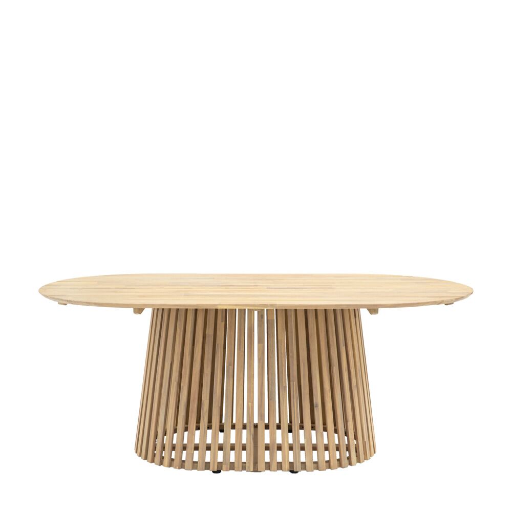 This elegant outdoor dining table features a sleek oval top and a unique, slatted base. Crafted from durable acacia wood, it adds a touch of sophistication and warmth to any patio or garden. With ample space for guests, this table is both stylish and functional, perfect for hosting gatherings or enjoying meals al fresco.