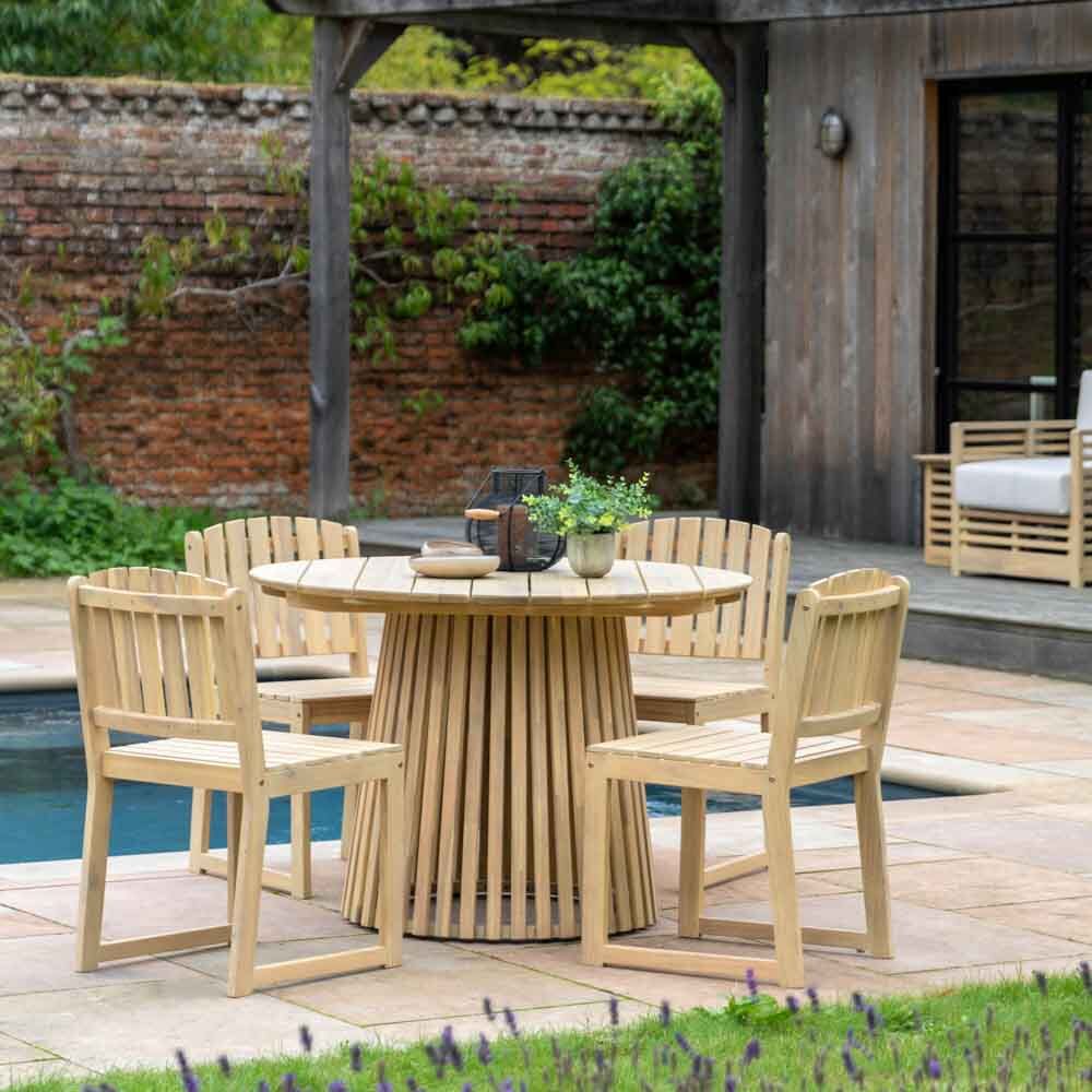 This elegant outdoor dining table features a circular top and a striking, slatted base. Crafted from durable acacia wood, it brings a touch of sophistication and warmth to any patio or garden setting. The slatted base adds visual interest and with ample space for dining, this table is perfect for hosting gatherings or enjoying meals al fresco.