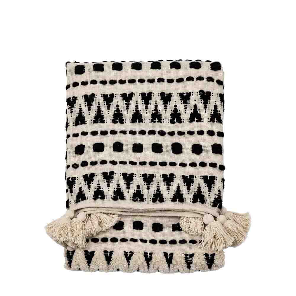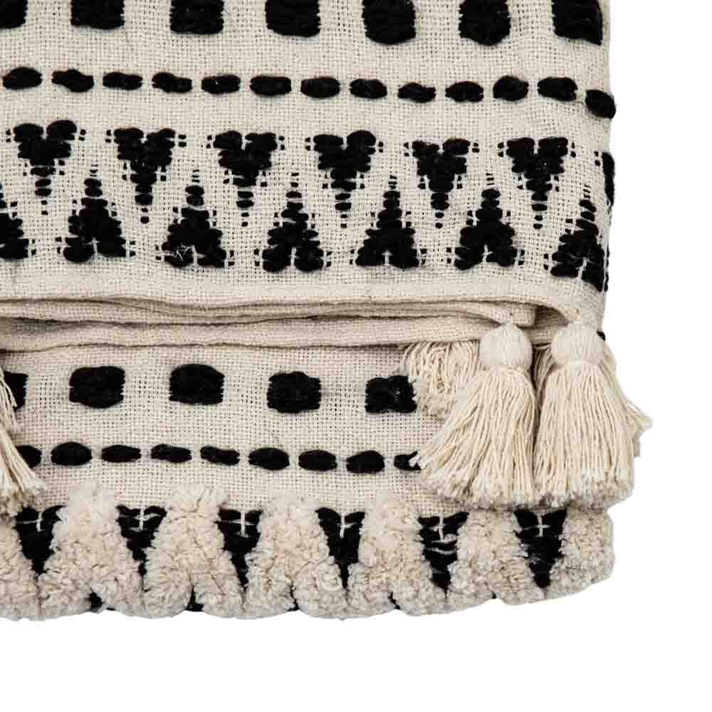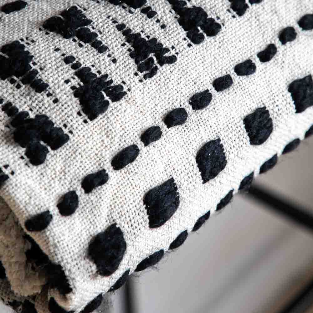 A stylish and contemporary tufted cream throw with a beautiful black stitched aztec design.