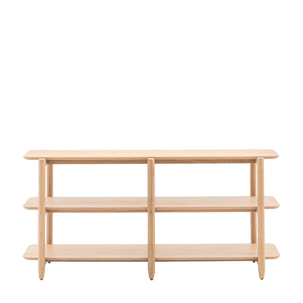 This open display in natural is a stylish and functional addition to any room. Its clean lines and oak construction create a minimalist and modern look. The three wide, spacious shelves offer ample storage space for books, plants, or decorative items. Perfect for adding a touch of Scandinavian style to your home.
