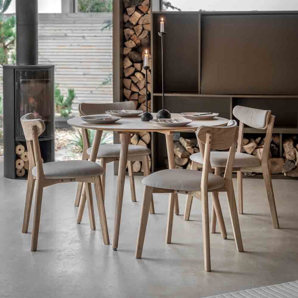Offering retro style with a contemporary touch, this beautiful round dining table is crafted from oak veneers and rubberwood with a natural finish. The table is also available in a smoked oak finish, and matching pieces are available.