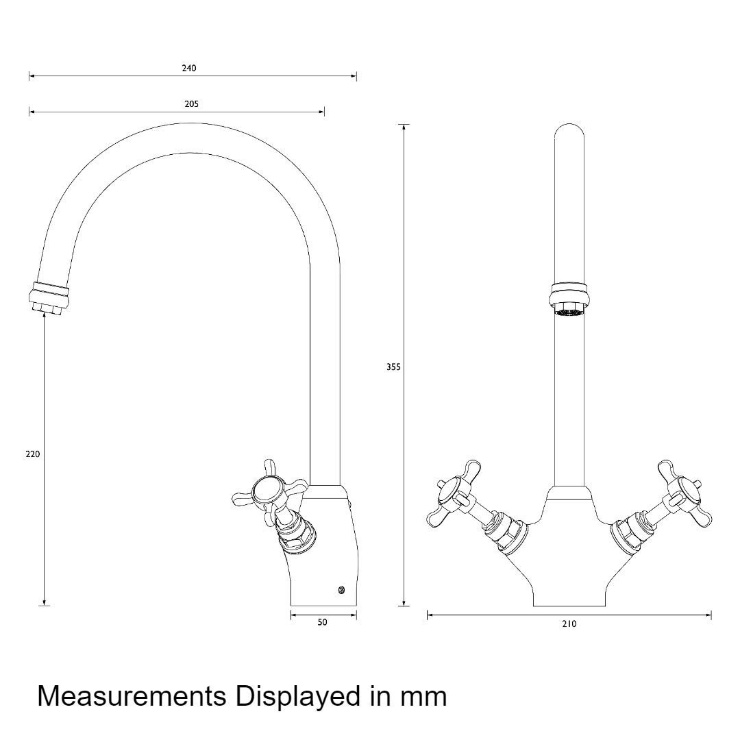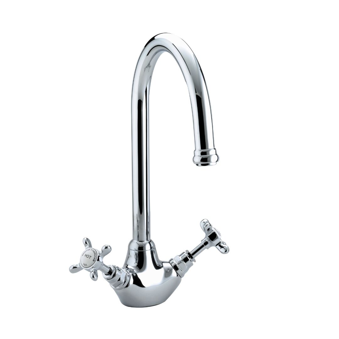 A traditional twin lever kitchen tap featuring Top Fix Easyfit technology. Unique patented top fix design, for simple installation from above the sink. Simply drop and twist the top fix base into the tap hole from above, and lock into place with the Allen key provided. Two supplied isolation valves and flexi tails mean you can connect to the water supply at this point and isolate the base. 10 year parts and 1 year labour guarantee for peace of mind.