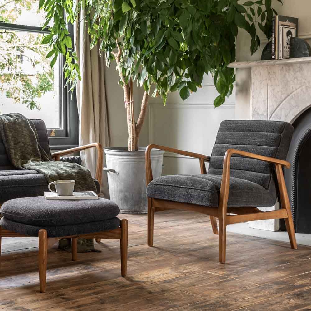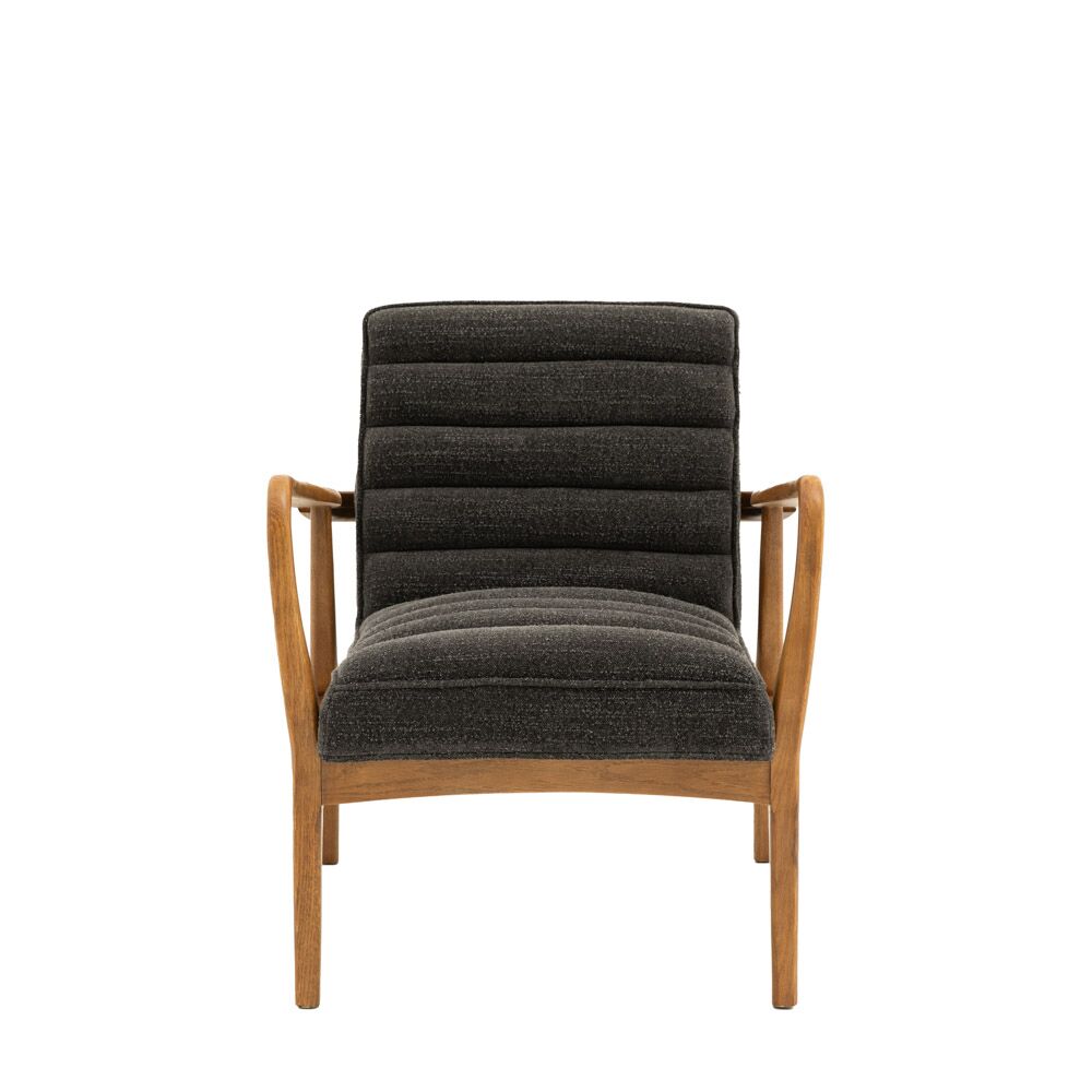 Featuring a sleek wooden frame with beautifully curved arms, this chair is upholstered in a plush, boucle fabric in deep charcoal, offering both style and cozy relaxation.