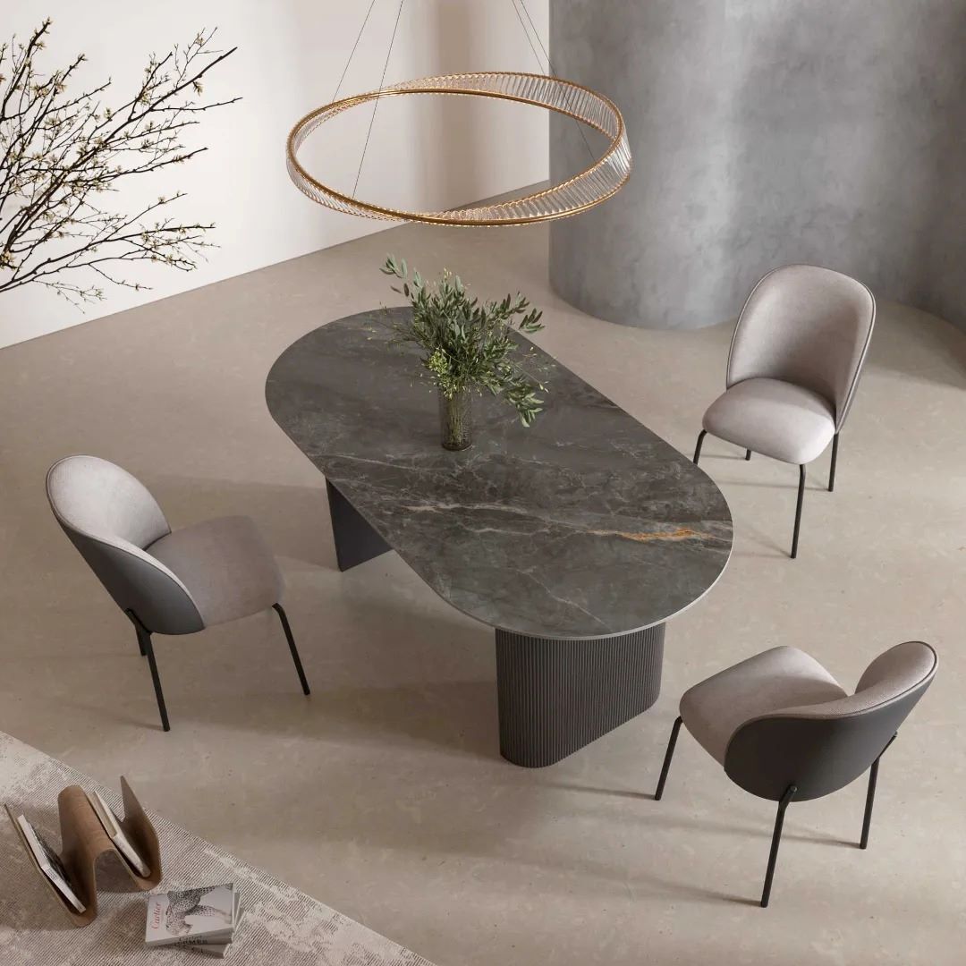 The Cartier Dining Range showcases the Ribbed Dark Grey design with a specially polished Grey Gold marble ceramic top. The range is versatile, featuring four distinct dining table options: Small Round, Small Square, Large Round, and Large Oblong. Crafted from 12mm Gloss Sintered Ceramic in a luxurious Grey Gold shade, these pieces are not only visually striking but also built to withstand the test of time.