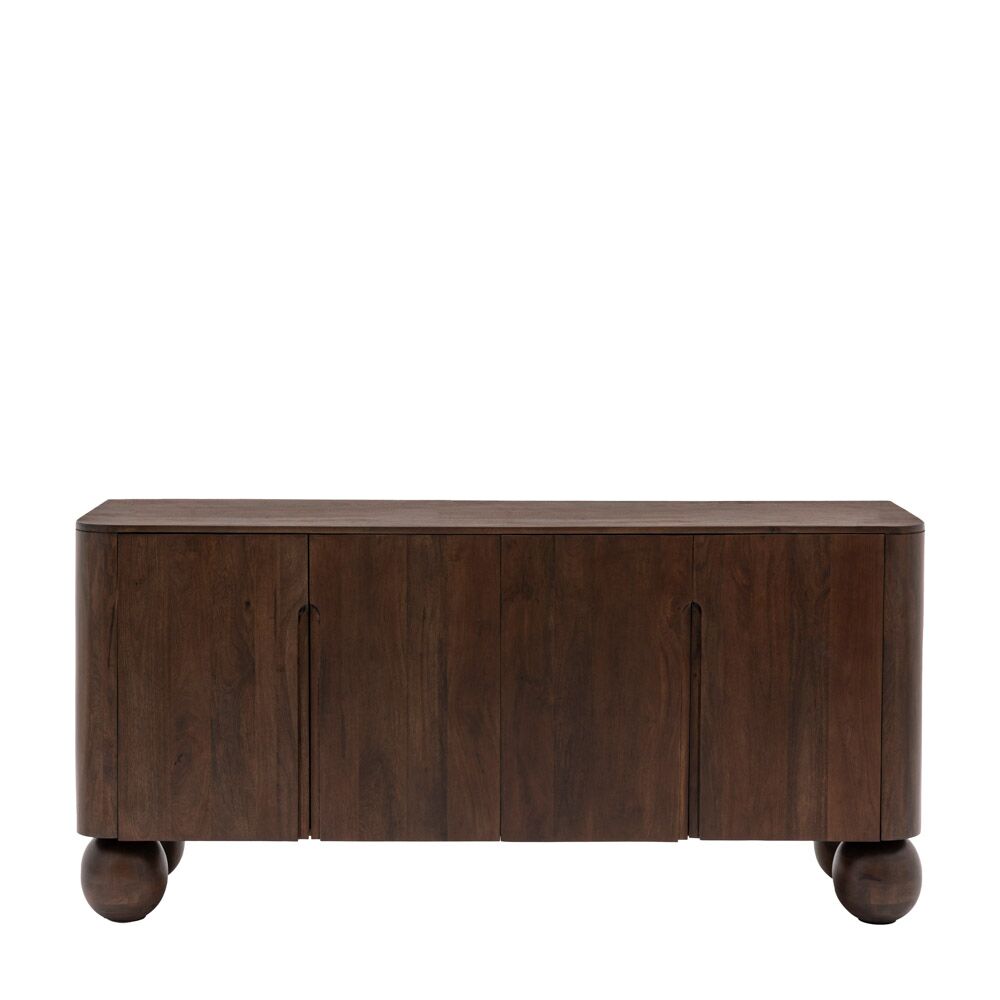 This eye-catching sideboard is crafted using mango wood solids with a rich deep finish. The front corners of the sideboard are gently curved with the elegant slim cut-out handles on the doors curving at the top to echo this. Turned ball feet complete the look to create this dramatic retro piece. Coordinating items are available.