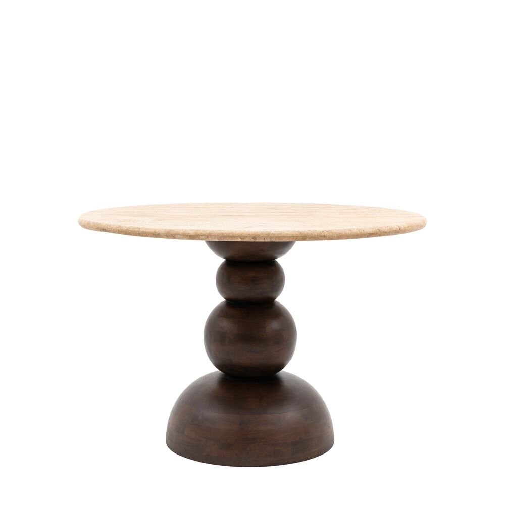 Offering a dramatic retro look, this stunning dining table has a solid travertine stone top whilst the base is crafted from mango wood solids with a rich deep finish which contrasts beautifully with the natural top. Coordinating items are available.