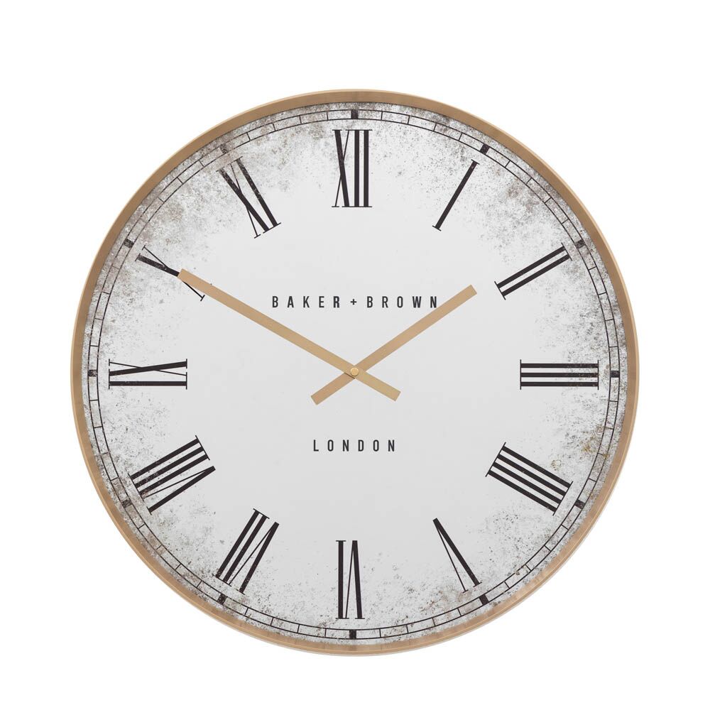 A captivating timepiece that blends classic charm with modern sophistication. This elegant clock features a large, round face with Roman numerals and a distressed finish, adding a touch of vintage flair to any space.