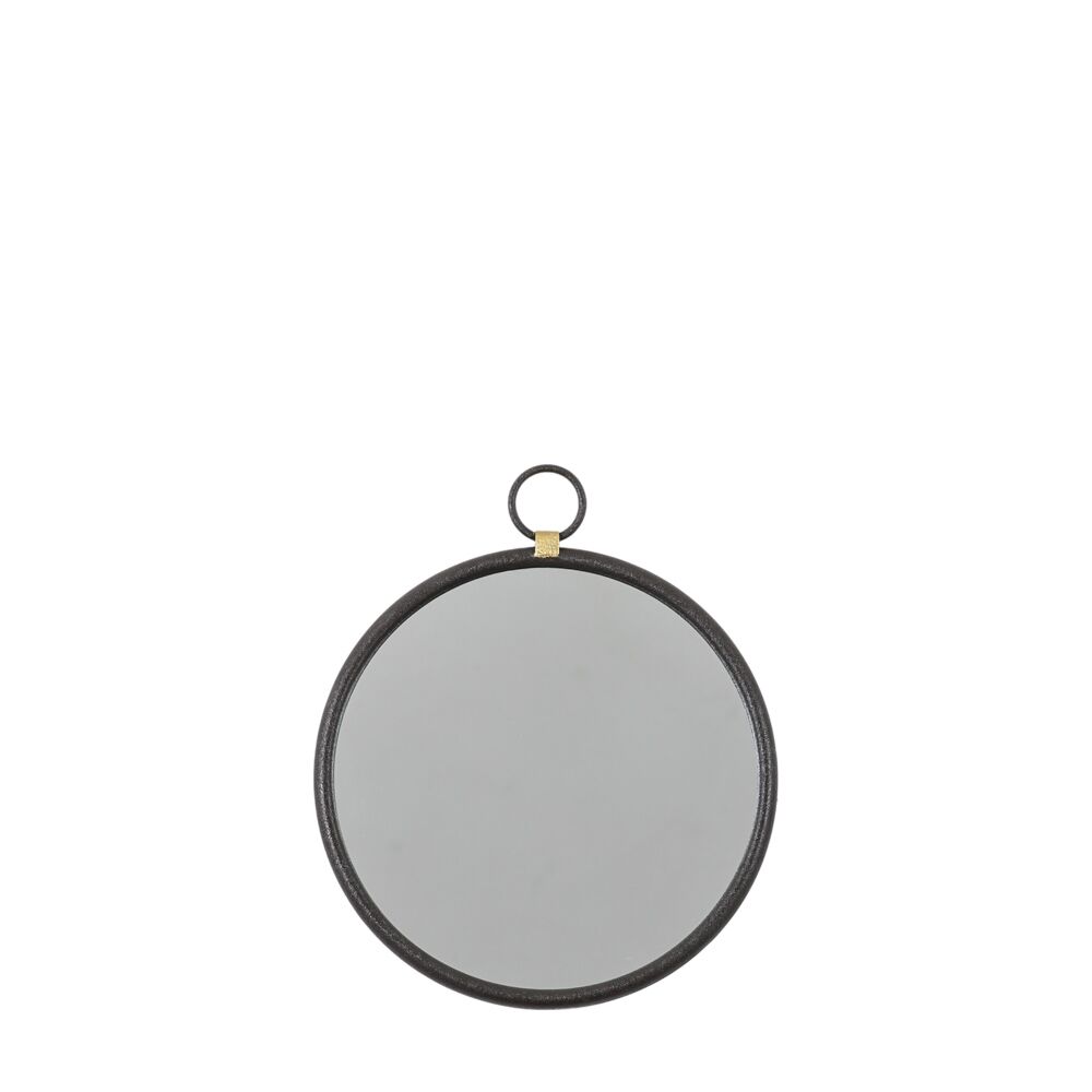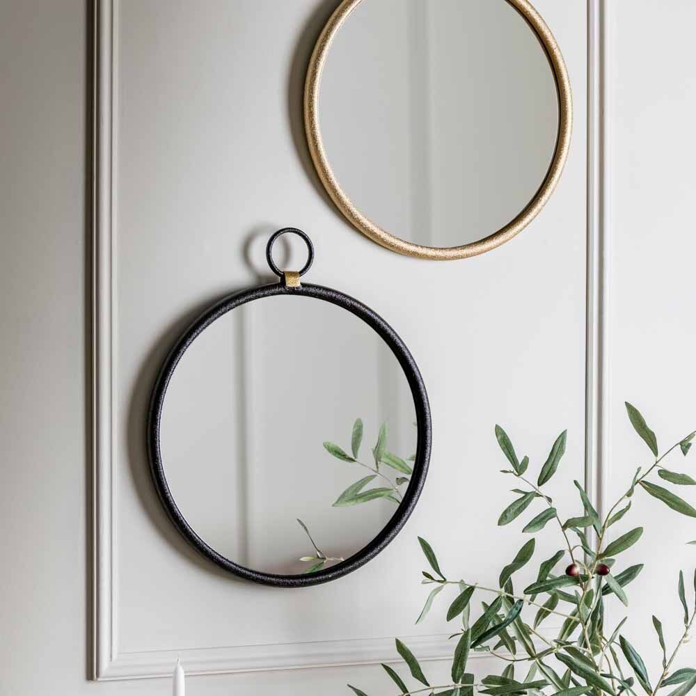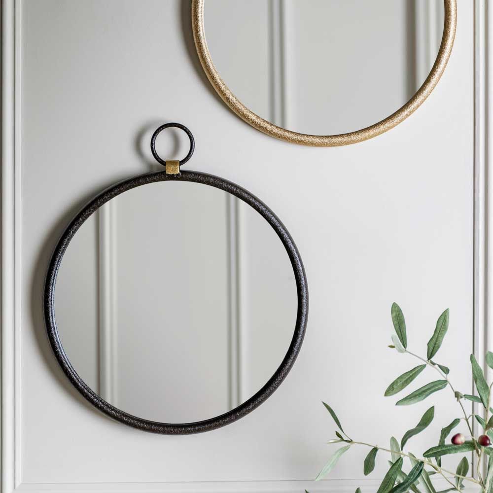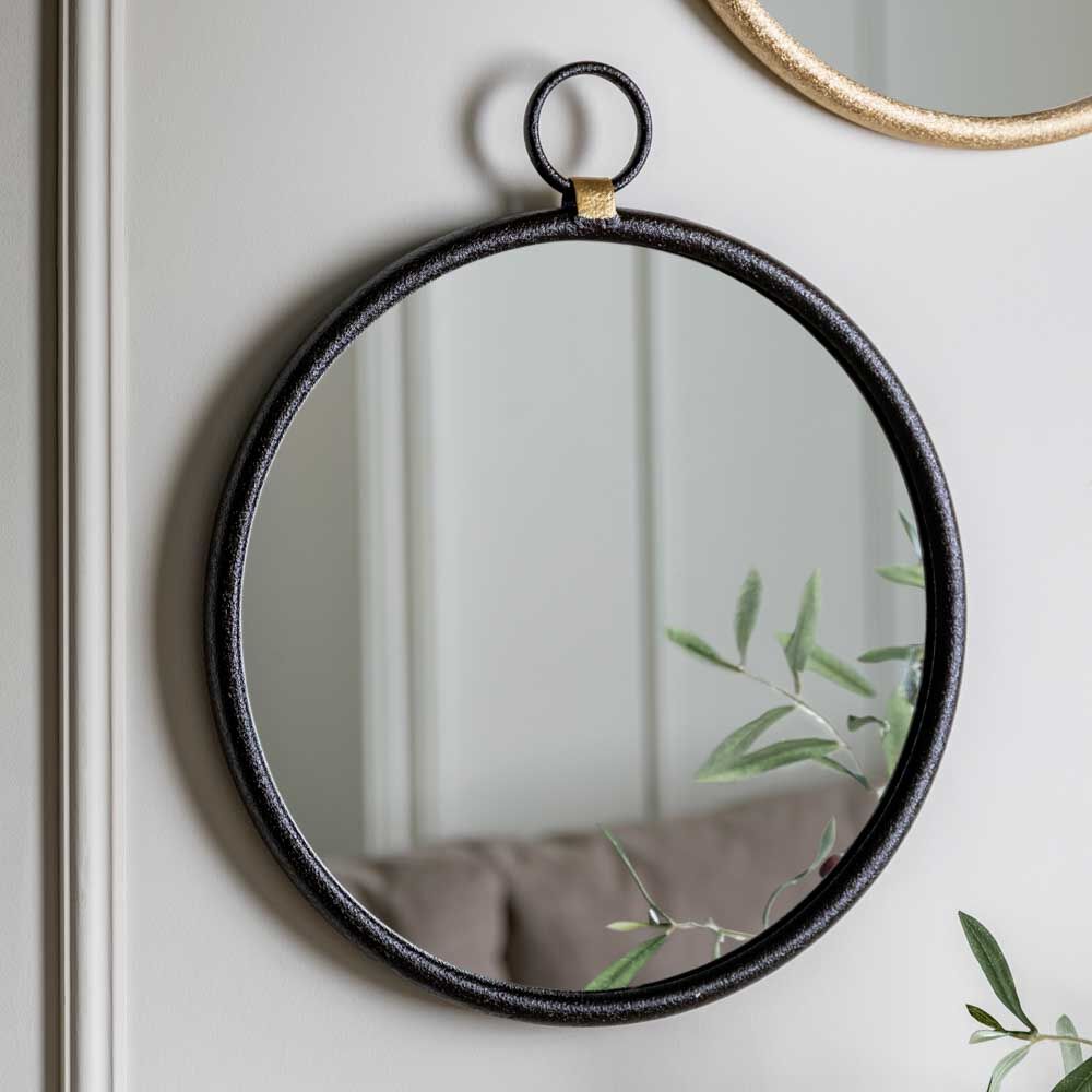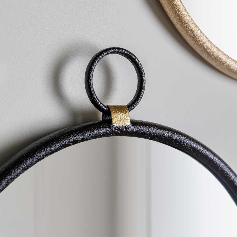 Simple yet stylish mirror with an industrial feel, featuring a black metal surround and ‘hanging’ loop, joined to the main frame by contrasting gold coloured metal to add a subtle detail. An ideal addition to lounge, bedroom or hallway.