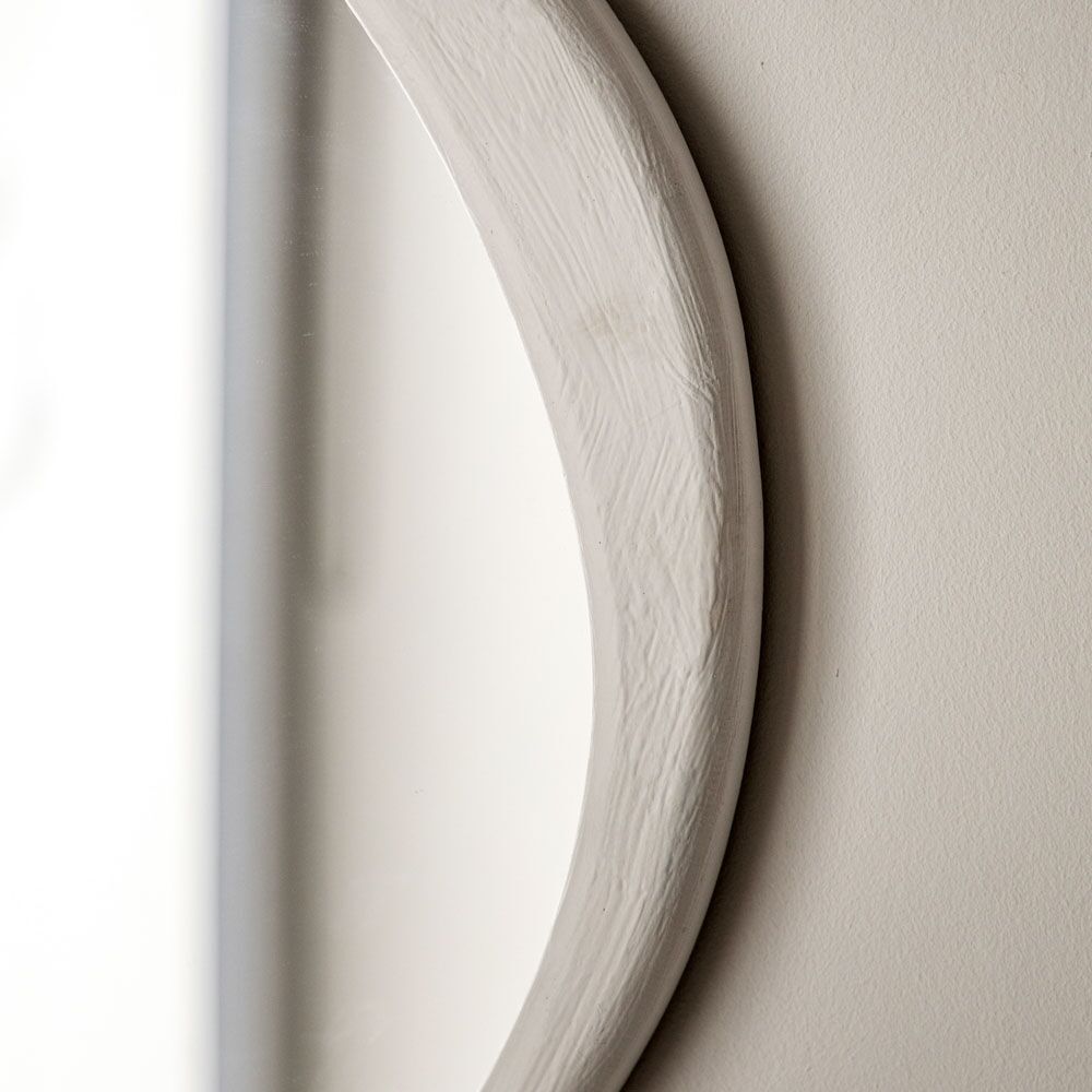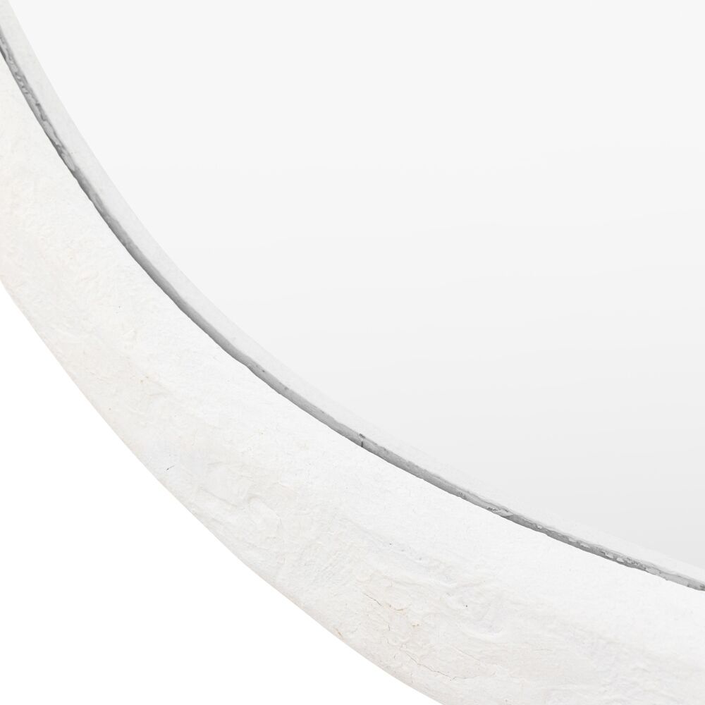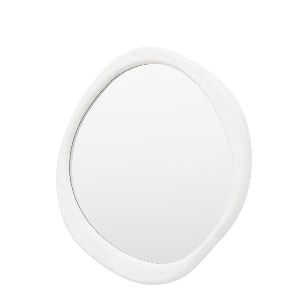 Round mirror with a white, concrete-effect frame and wavy, irregular edges. The mirror appears to have a unique, artistic design, with a modern and slightly organic feel due to its uneven frame. This kind of mirror would be a statement piece in any room, adding a blend of industrial and natural elements.