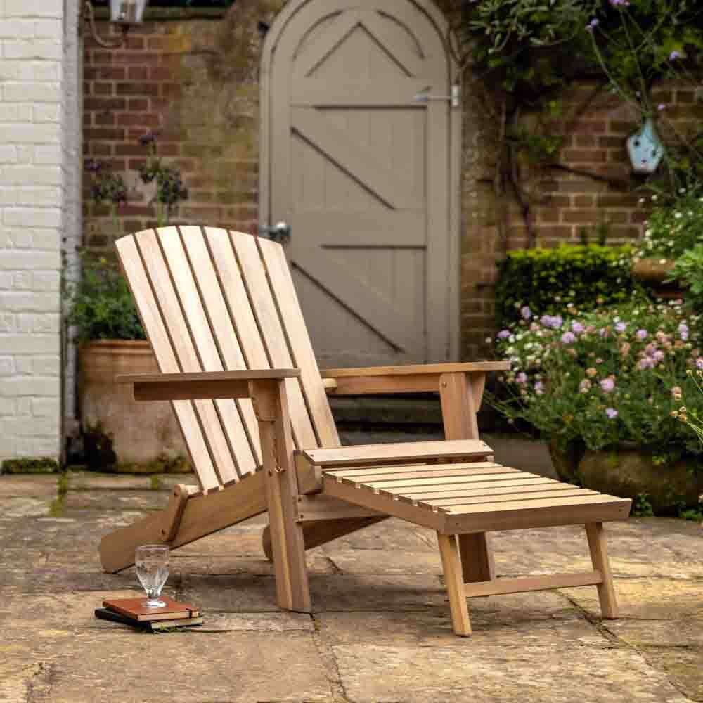 A classic design with a twist this lounge seat features a pull out footstool, right from the front of the seat, to give you extra comfort when lounging about in the summer sun. The pull out footstool simply slides away when not needed, just pull it and unfold the leg support when you want to lie back and relax. Made with FSC Acacia wood the whole lounge eat folds away for easy storage, perfect for when space is tight.