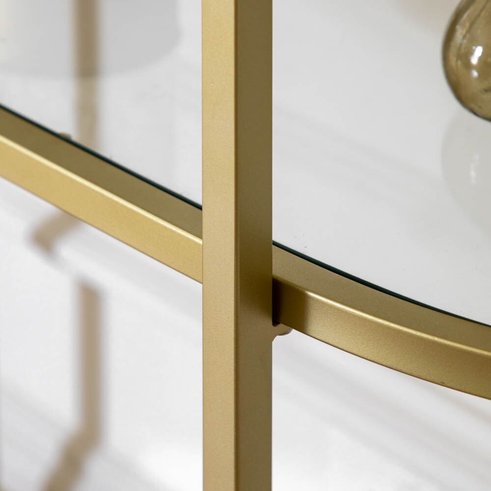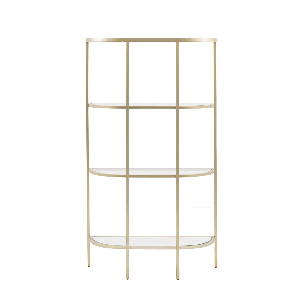 Glamorous 4 shelf display unit with a beautifully elegant curved shape. The 3 glass shelf inserts and a mirror glass bottom shelf sit in a champagne finish metal frame, perfect for adding a luxurious touch to any room.