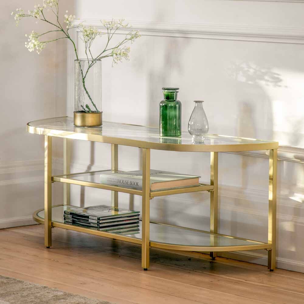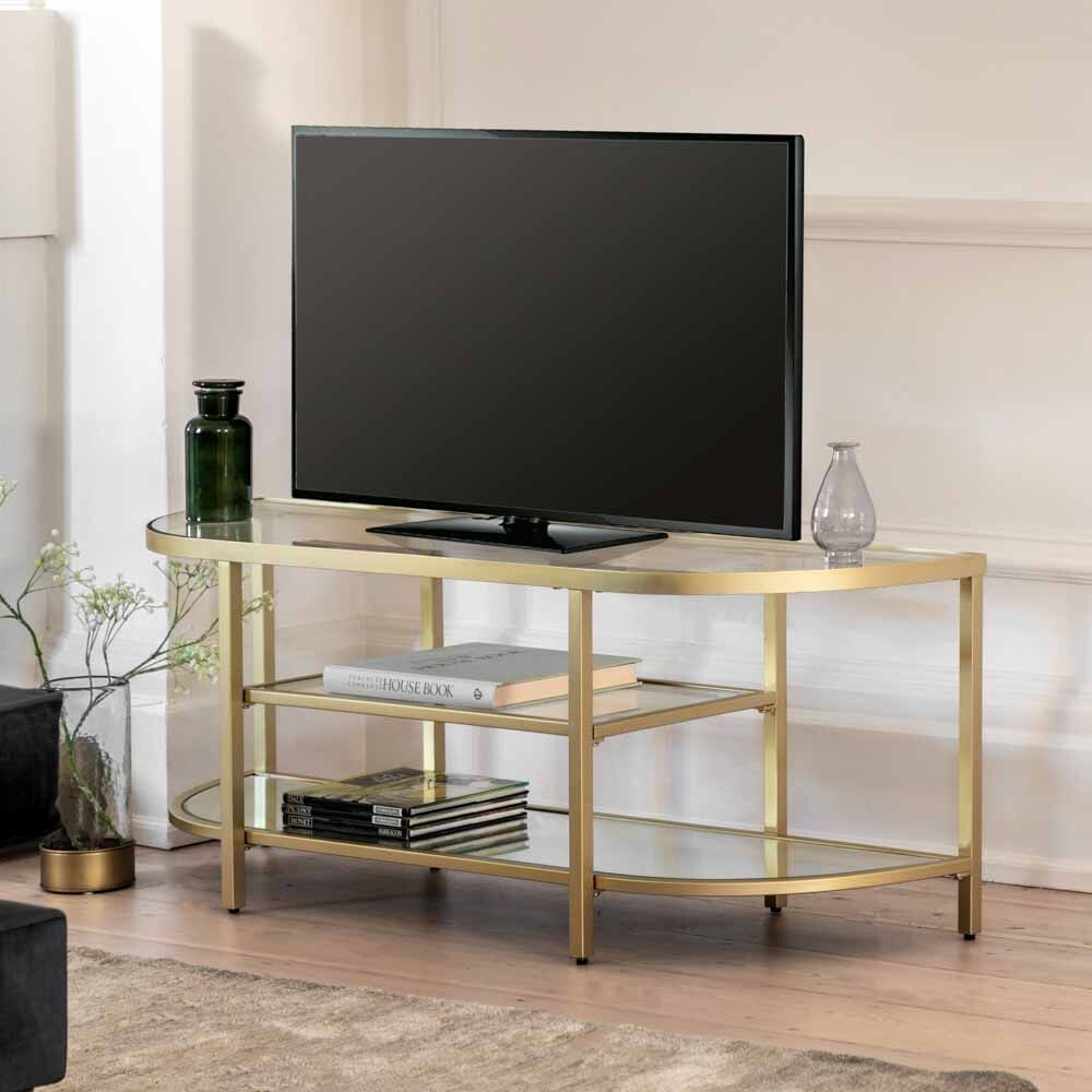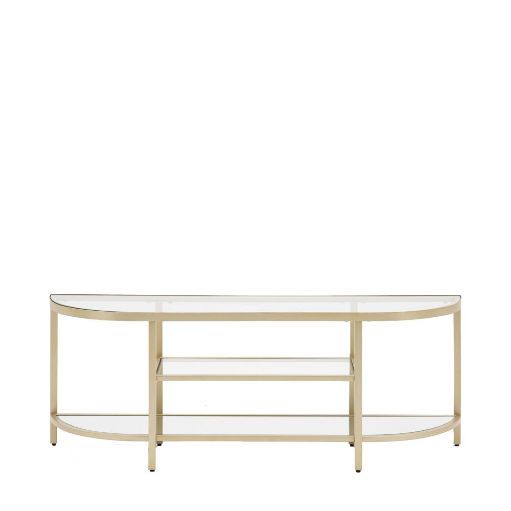 Luxurious low media unit with elegantly curved shape, perfect to add a little glamour to your media set up. With top and middle glass media shelves and a mirrored glass bottom shelf all in an elegant metal frame with a champagne finish this media unit is unashamedly glamorous and luxe.