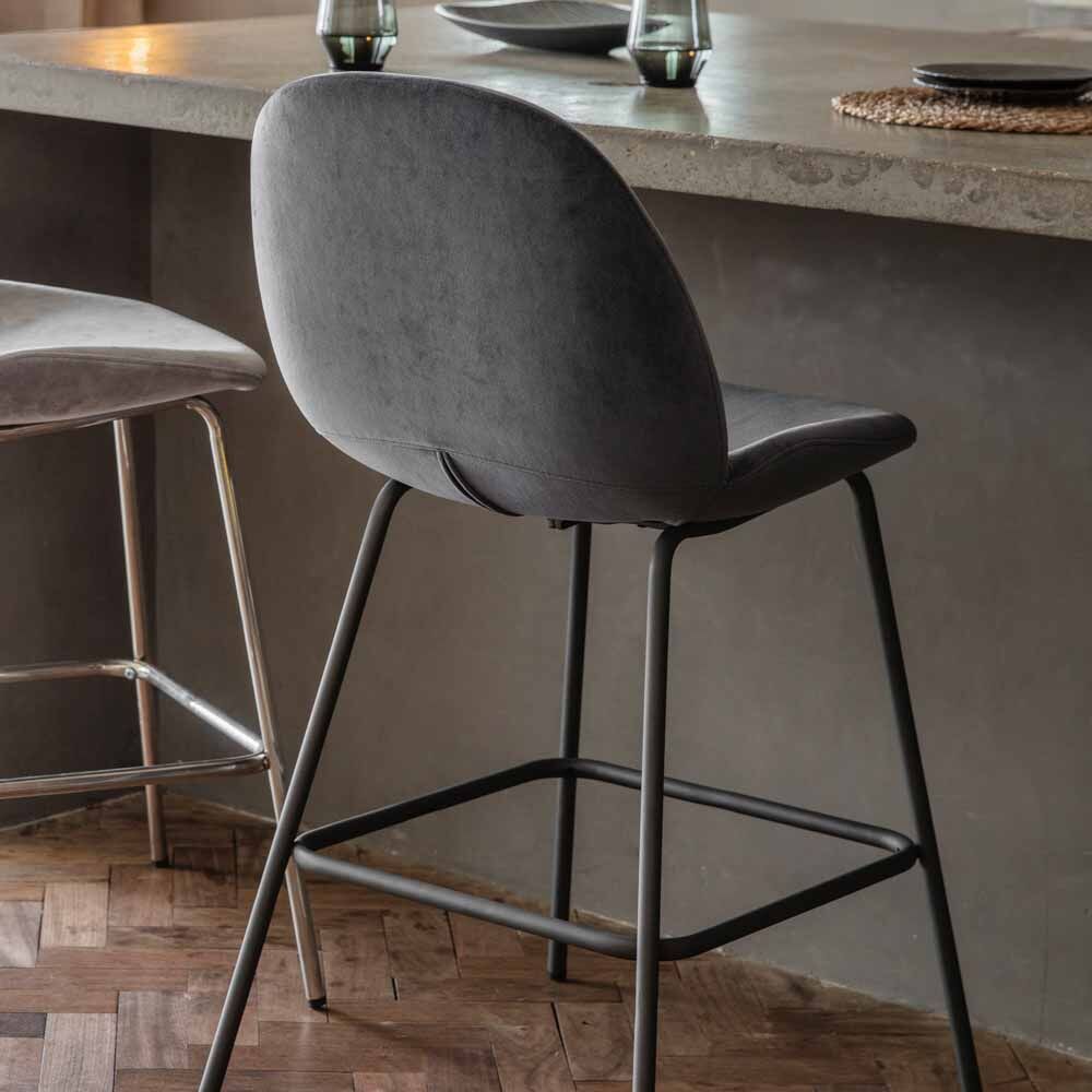 Thia stool offers simple, contemporary design, with its sleek seat and metal base. The dark grey velvet pairs perfectly with the black finish of the base to give a chic sophisticated look. Available in two other colours, and there are also dining chairs in five colours.
