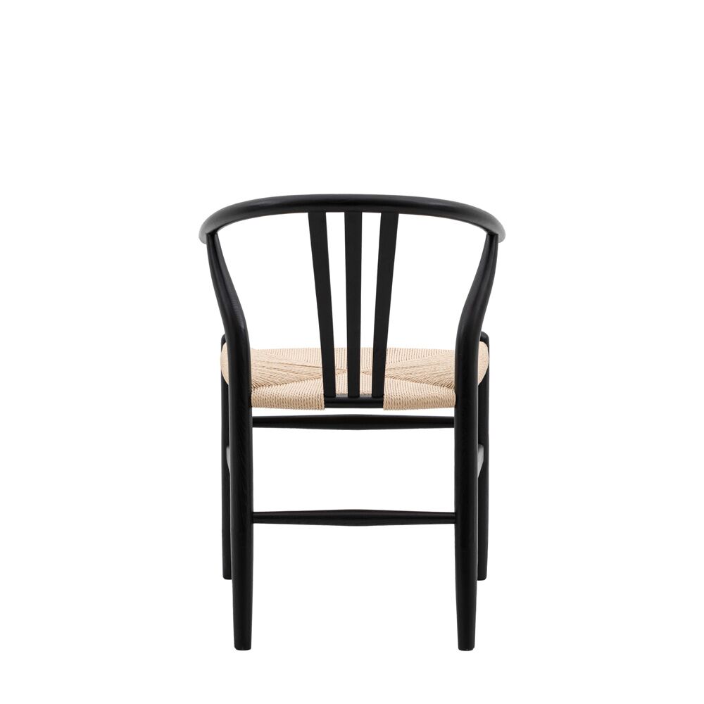 Set of 2 stylish dining chairs perfectly designed to suit both modern and vintage influenced interiors alike. With bold black stained wood, distinctive wishbone backs and hand woven seats, these chairs will make a stand out style statement wherever they’re used.