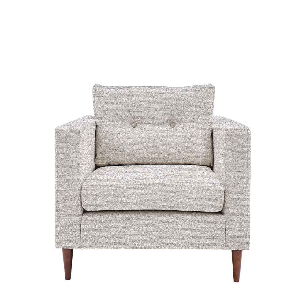 Offering stylish contemporary design, this lovely armchair features sleek lines with block arms and button detailing on the back paired with elegant tapered wooden feet. It is upholstered in a lovely light grey coloured fabric.