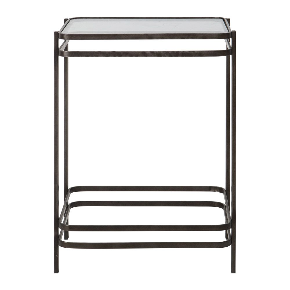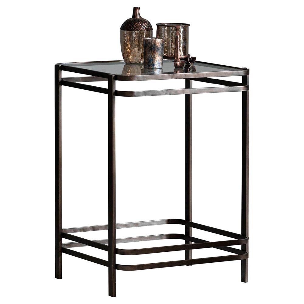 An accent piece, this inlaid glass topped side table has a brushed metal frame
