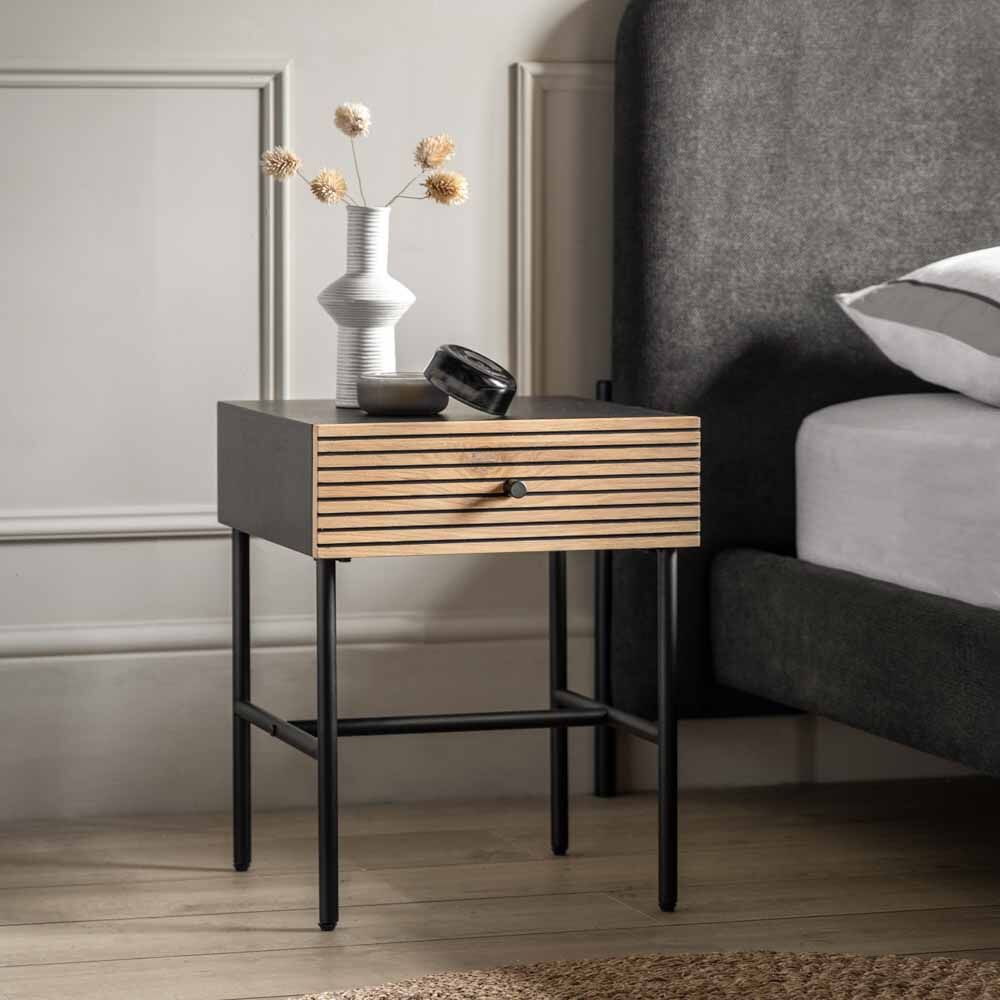 Add a contemporary look to a room with this stylish bedside. The carcase has a black finish with a pressed woodgrain effect to create a premium look. The drawer fascia is real oak woodgrain veneer with a feature black line pattern. A black metal underframe and drawer handle complete the look. Matching items available.