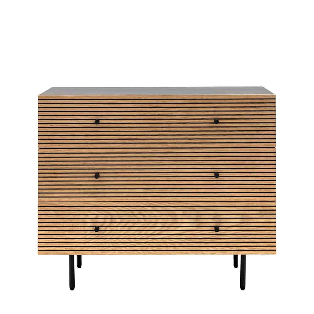 Add a contemporary look to a room with this stylish chest of drawers. The carcase has a black finish with a pressed woodgrain effect to create a premium look. The drawer fascias are real oak woodgrain veneer with a feature black line pattern. A black metal underframe and drawer handles complete the look. Matching items available