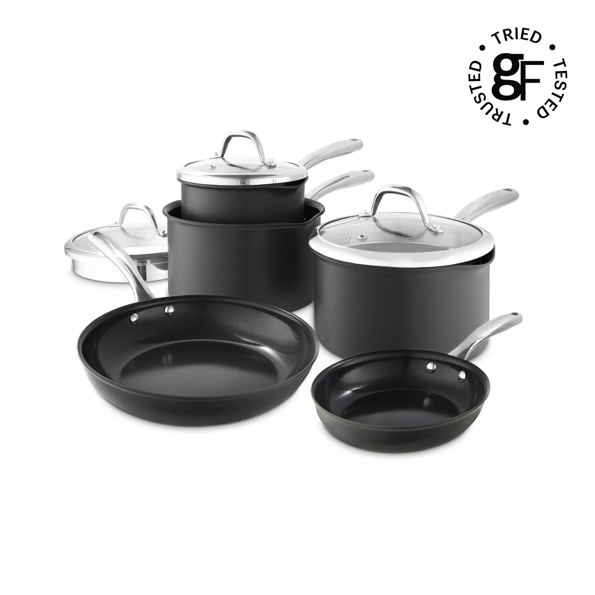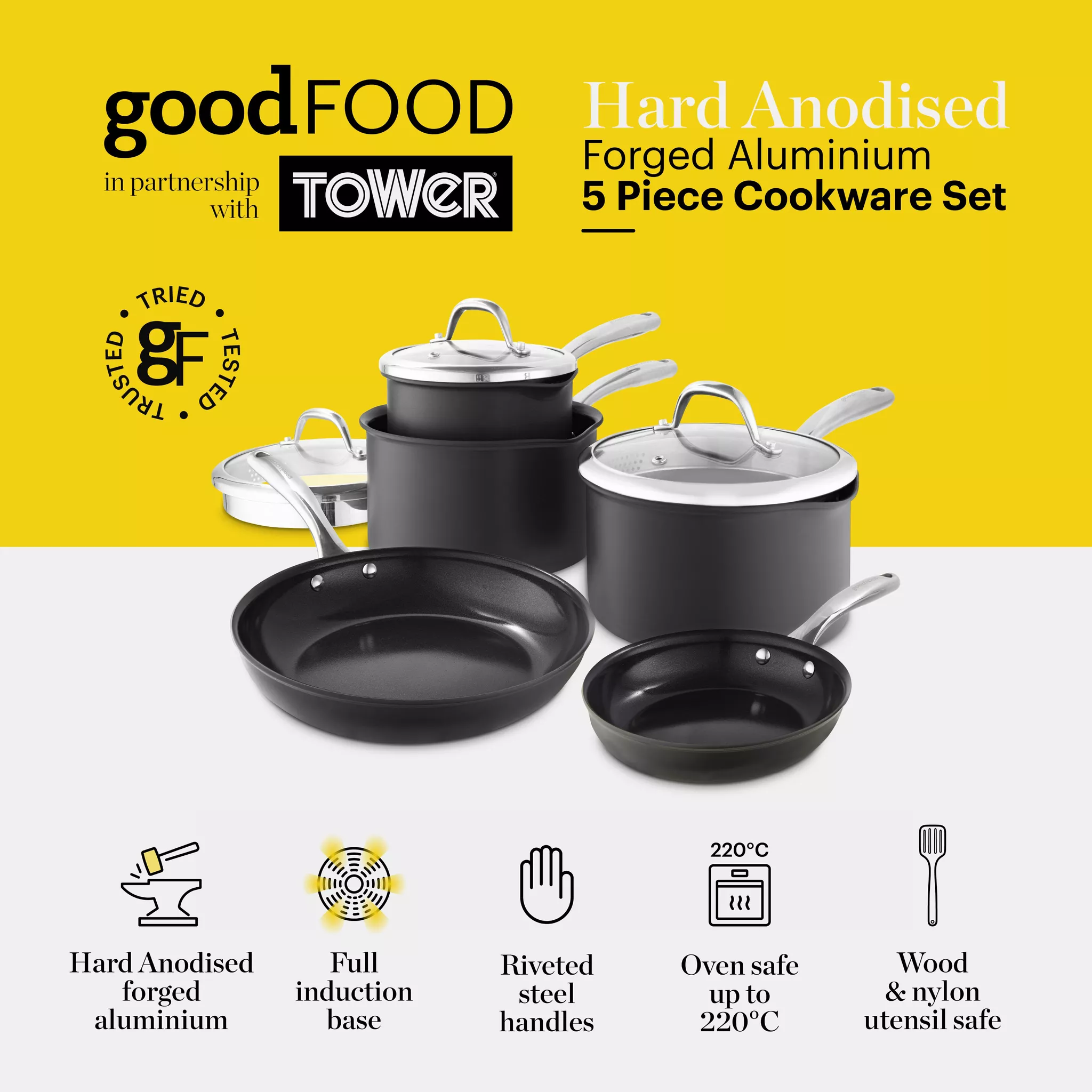 Good Food By Tower GF900258 Hard Anodised 5 Piece Cookware Set with Tempered Glass Lids – Grey