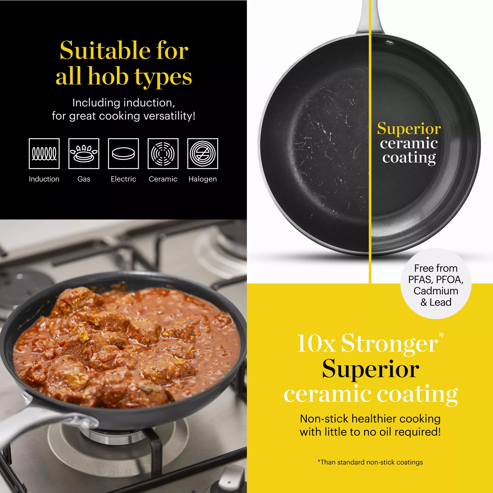 | Induction base for quick and even heat distribution | Suitable for all hob types including induction |