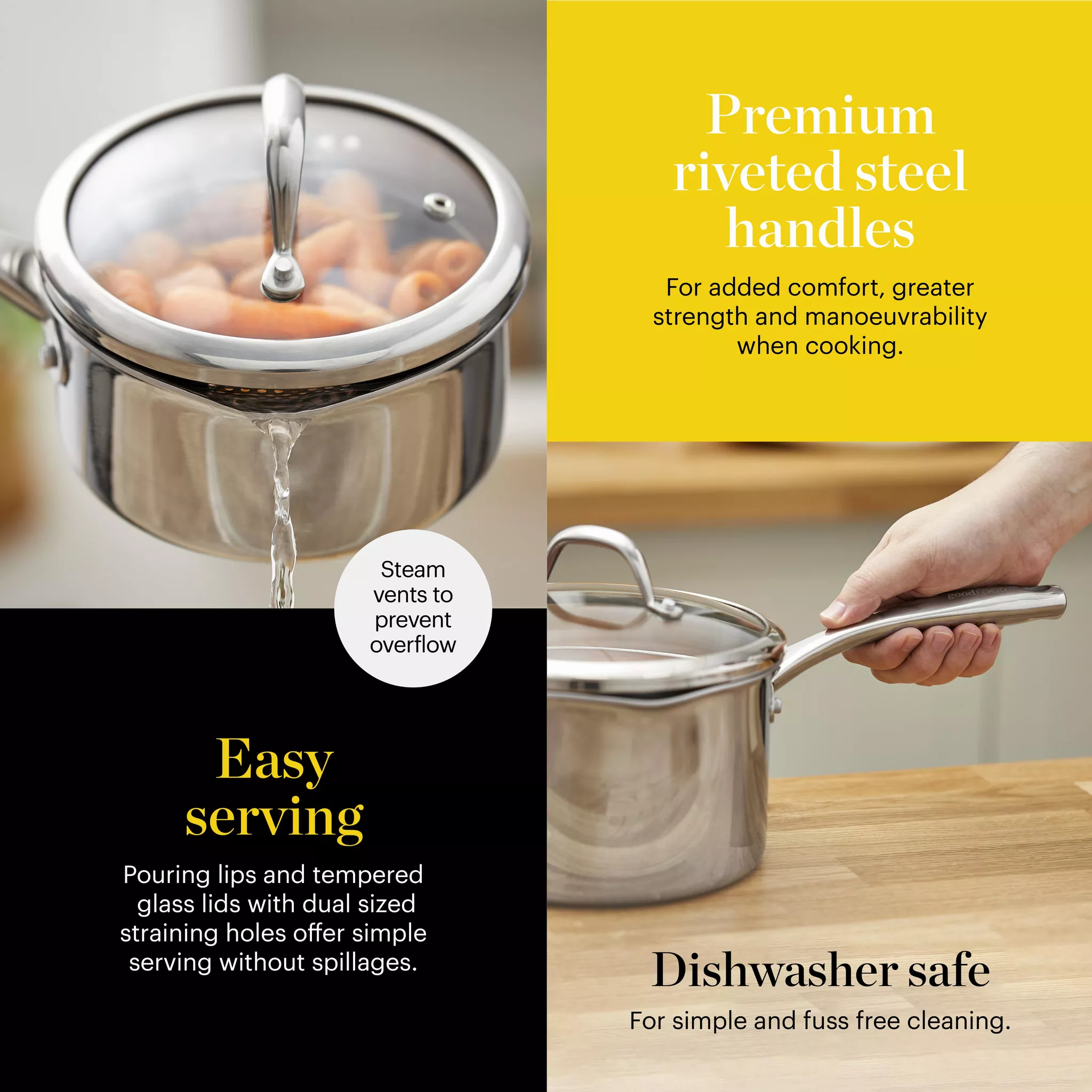 | Tempered glass lids with steam release vents | Riveted cast steel handles / inner capacity markings |