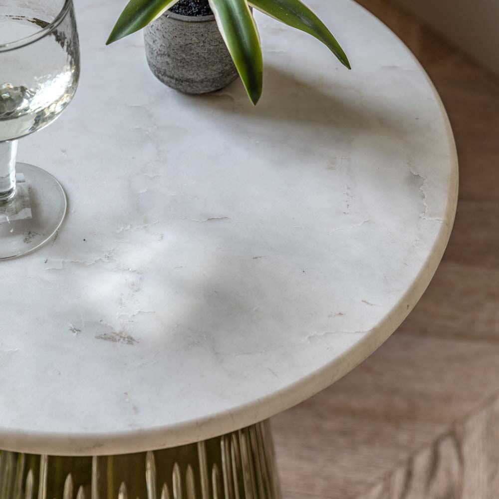 Add some luxe to your room with this unique side table. The incredibly stunning dusk toned glass base features a unique design of liner striations which is not to be outdone by the metal collars and the ultimate in luxury, a white marble table top. Also available in a blue glass base.