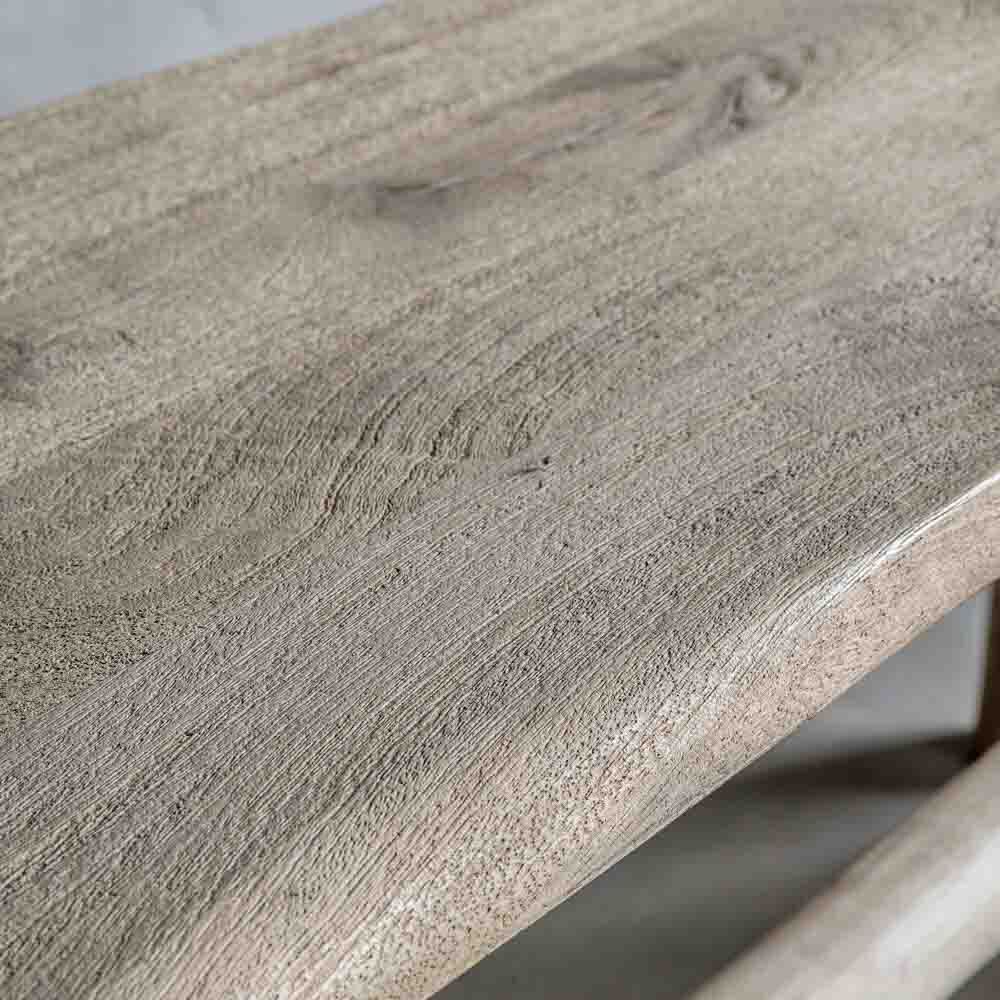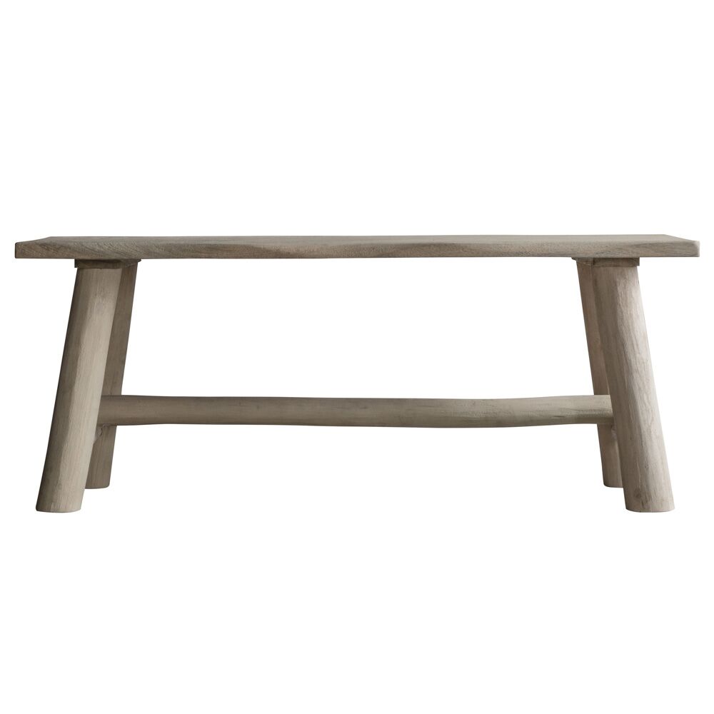 Made from Eucalyptu & mango wood this Bench has a soft natural finish, with rustic turned legs and a natural edge on the top for a country feel. A larger version is available, and both sizes are also offered in a rustic grey finish.
