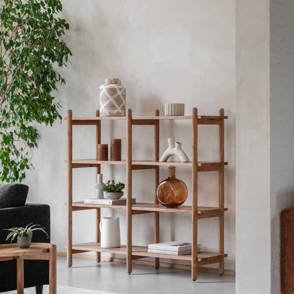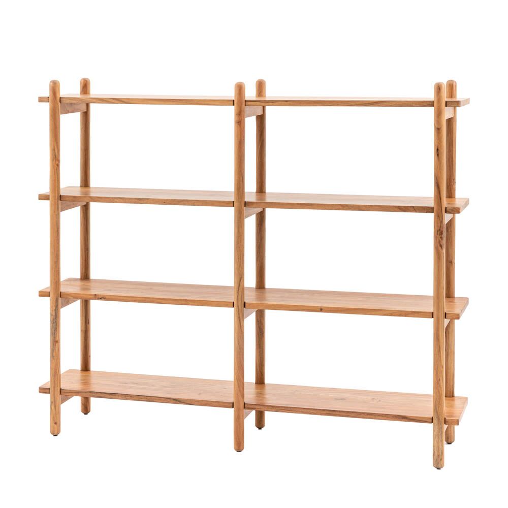 With an open design, this display unit is perfect for showing off your book collection and favourite artistic pieces. Made from rich Mango wood the wide 4 shelf unit has a clear vintage design influence with its slim shelves and rounded uprights, making it perfect for modern eclectic interiors. Coordinating pieces also available.