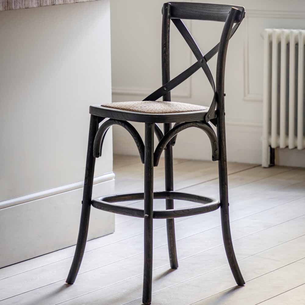 Set of 2 French bistro style bar stools. Perfect for enjoying your morning coffee and croissants. With an elegant cross back design, curved leg detail, solid rattan frames and hand woven rattan seats, perfect for bringing a little French cafe touch to your home.