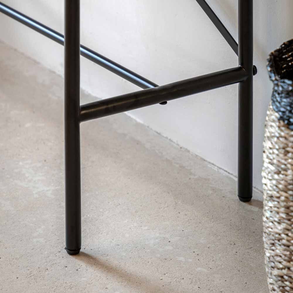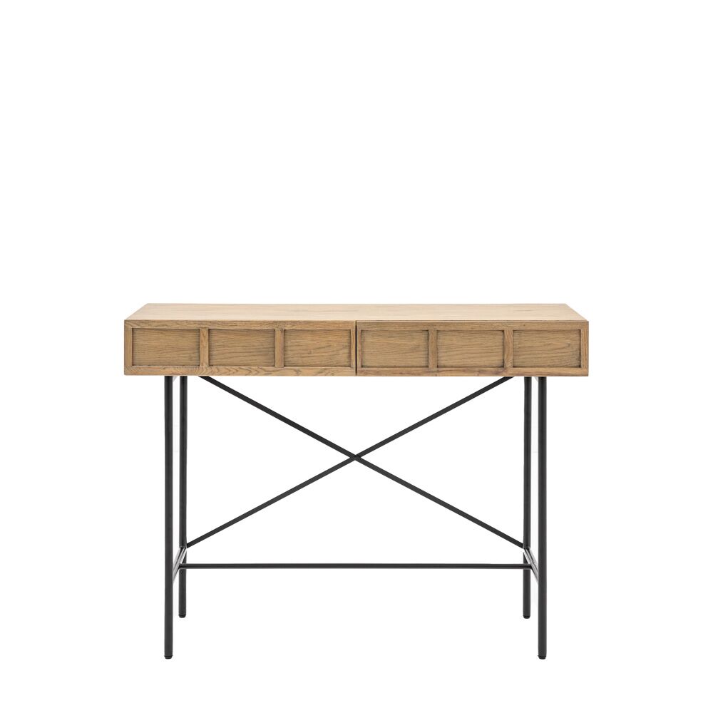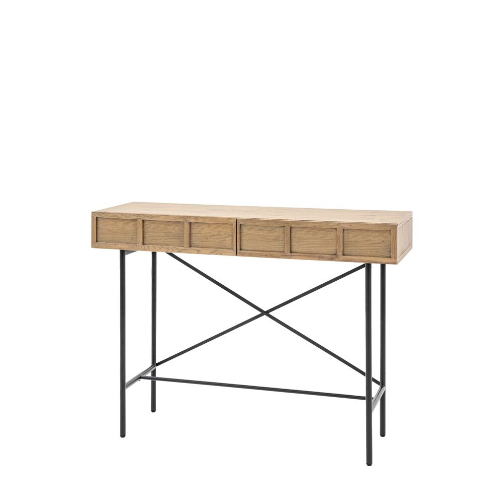 This lovely console table is designed for modern apartment living but would look equally at home in a range of interiors. It has retro style panelled fascias in oak veneers and solids with a weathered grey finish, paired with black metal legs and underframe. Matching pieces are available.